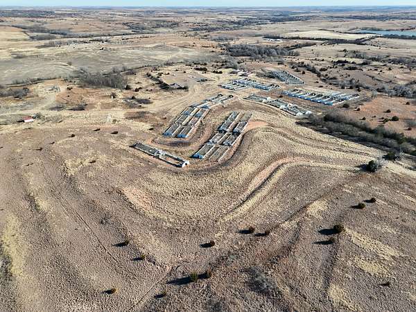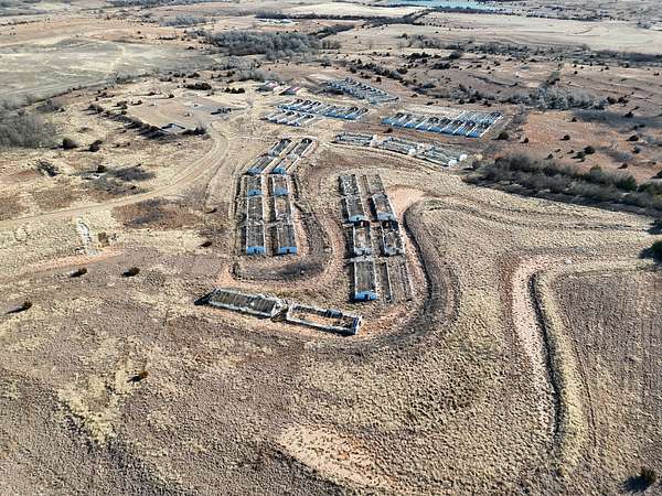 Roger Mills County property features 50+ climate-controlled hoop barns (82x27), dual water wells, extensive commercial electric service throughout, living quarters, workshop buildings, and 60 acres of cultivated ground. Located at
