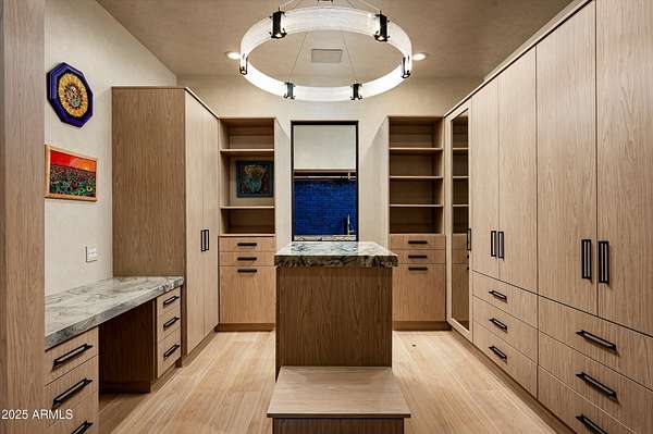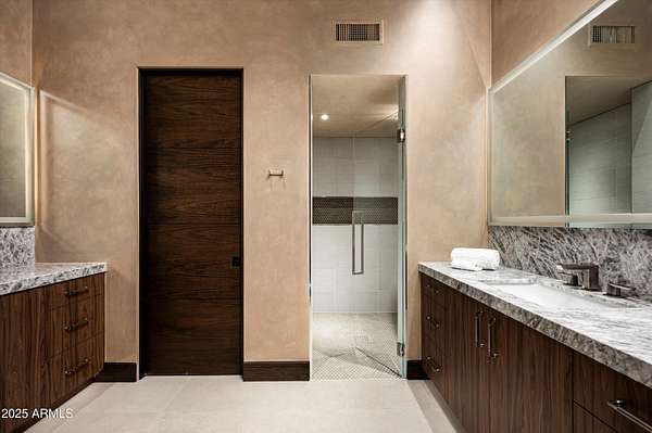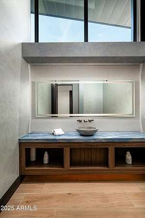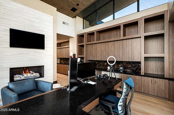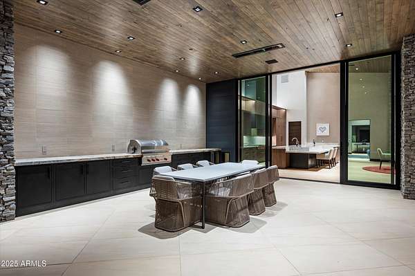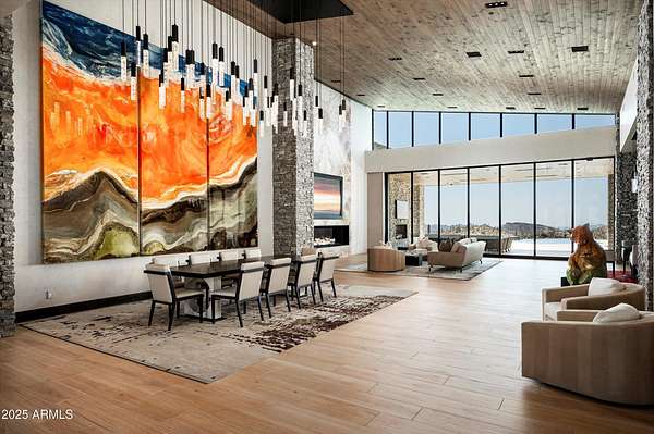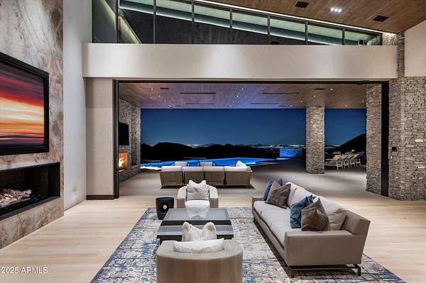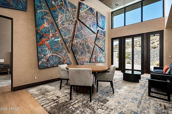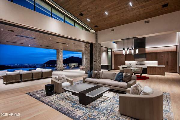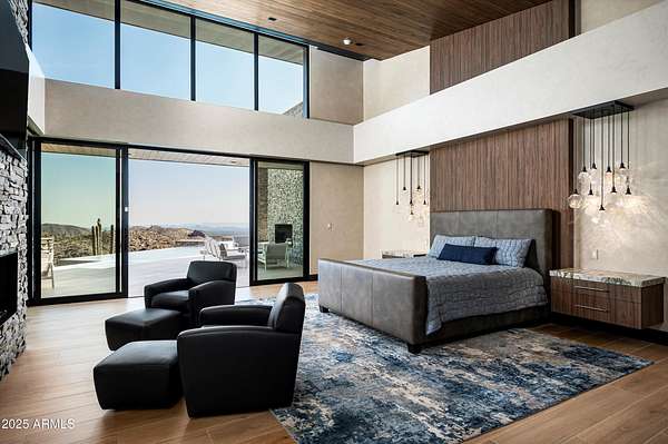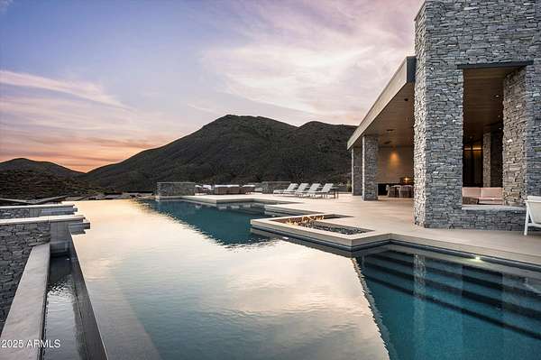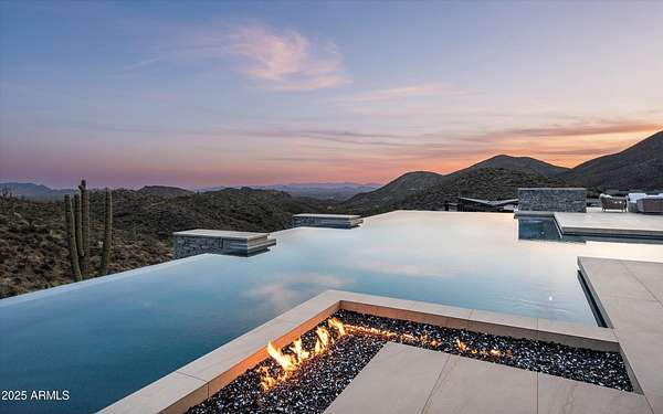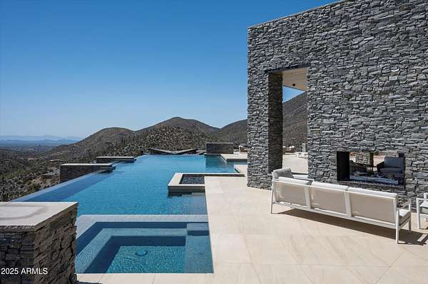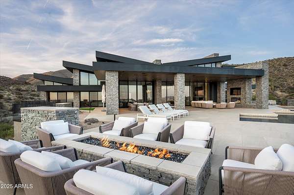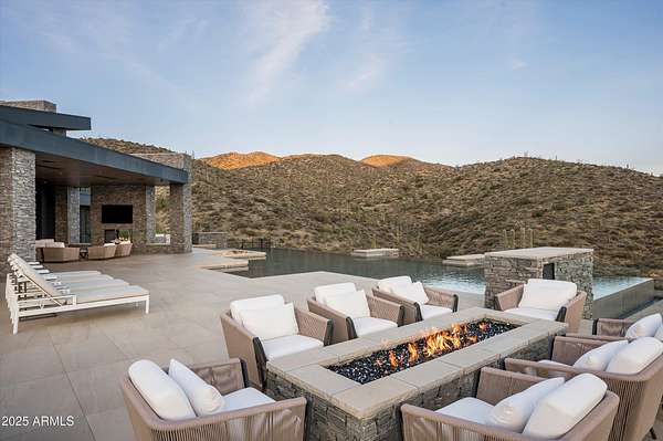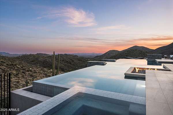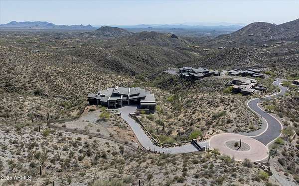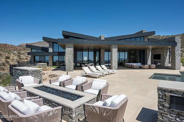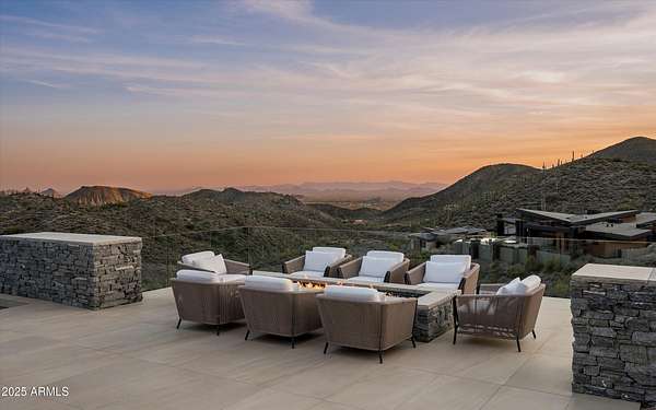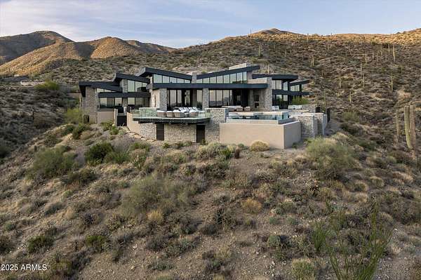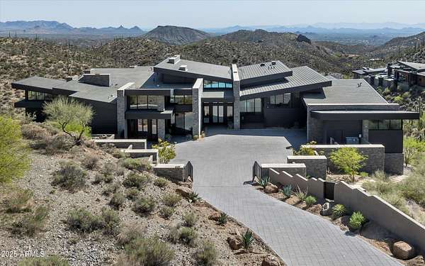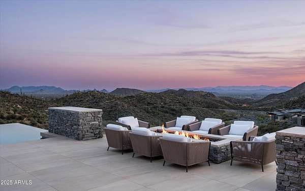 One of a kind Contemporary estate located in the world class community of Desert Mountain in North Scottsdale, Arizona. Designed and built by one of the top design build firms-JK Properties-Justin Kilbane. Situated on 4.7 acres at the top of the Desert Mountain community and overlooking the valley of the sun, this setting is arguably one of the best in all of North Scottsdale. With 3,000 acres of open space that parallels the home as well as the Tonto National Forest just to the north, this extremely private setting is unmatched. As you enter the private gated driveway, you will be awed by the striking design of this home. Once inside the one level open great room floor plan leads to an expansive outdoor living area complete with spectacular views in every direction. Enjoy the dual sided fire feature as you take in the panoramic desert and mountain views. The seamless connection between the indoor and outdoor spaces allows for the perfect environment to entertain guests or unwind in solitude. The design incorporates floor-to-ceiling glass walls that flood the space with natural light, while also offering unparalleled privacy. The home boasts high-end finishes and state-of-the-art appliances throughout. The gourmet kitchen is equipped with top-of-the-line appliances, a large center island, and custom cabinetry that perfectly complements the sleek design of the home. The primary suite is a private retreat, complete with a spa-like bathroom featuring a soaking tub, sauna, a spacious walk-in shower, outdoor shower with views of the mountains and dual vanities. In addition, the home also features four guest suites and beautiful study with dramatic mountain views. Two of the guest suites are located in the "in house" casita complete with sitting area, kitchenette and fireplace. Outside, the property continues to impress with its resort-style amenities, including a negative-edge pool, spa, outdoor kitchen, and ample lounging areas. The combination of luxury, modern design, and the unparalleled natural beauty of Desert Mountain make this estate an extraordinary living experience. With access to the world-renowned Desert Mountain Golf Club, fine dining, and a variety of outdoor activities, this estate offers the perfect balance of tranquility, beautiful design and high-end living. Whether you're seeking a private retreat or a space to host guests, this home offers the best of both worlds. This home sits on two lots that were combined into one homesite. There is ample space left to add an additional structure if one would choose to do so. Justin Kilbane is available to discuss design options for additional garage and structure space. Included in this offering is the homesite next door, lot 357A-9607 E Cintarosa Pass, Scottsdale , AZ 85262 Home is being offered furnished with several exceptions. Also, the only art that would convey would be two pieces - the large piece in the dining room as well as the large piece in the "in house" casita. A full Golf membership as well as a Lifestyle membership are available from the seller.