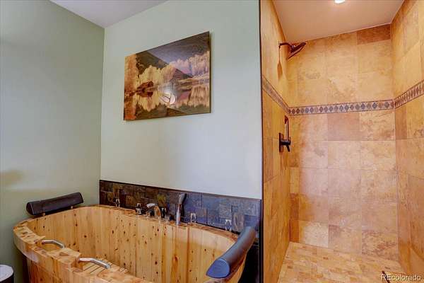 Upstairs, the primary suite features a vaulted tongue-and-groove ceiling and a private deck. The primary bathroom includes a cedar soaking tub, oversized walk-in shower, and custom dual vanity. An additional bedroom with deck, a loft with built-ins, and a updated half bath provide flexibility on this level.