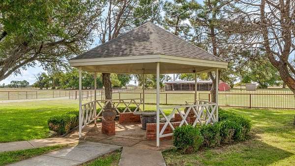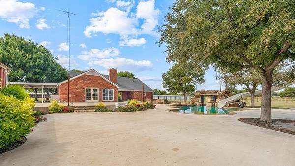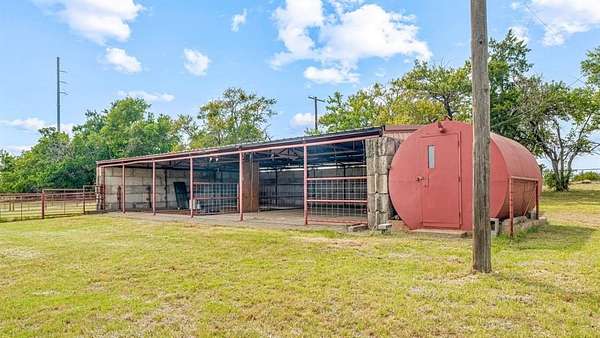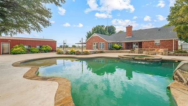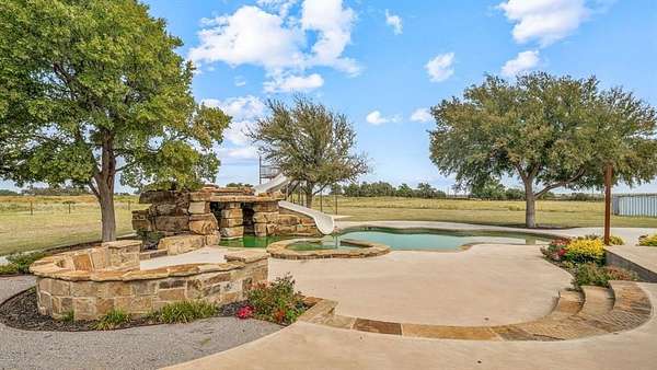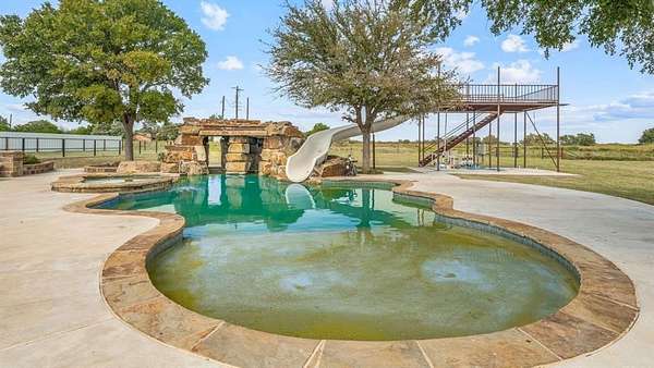 The land features excellent improved grazing pastures, cross-fenced into four sections of approximately 21, 21, 12, and 2 acres--ideal for rotational grazing and livestock management. Each pasture is equipped with piped water, supported by two water wells. Upon entering the property through the gated, pipe-fenced entrance, you will see the main residence with a front yard comprised of thriving fescue grass, supported by an automatic sprinkler system. The three-bedroom, three-bath home has been recently renovated and modernized with an open-concept layout connecting the entry, dining, living, and kitchen areas. Reclaimed wood beams, natural light, and warm tones bring together rustic charm and modern comfort. The fully remodeled kitchen features custom cabinetry, a massive 9-foot quartz island, and GE Monogram commercial-grade appliances--including a 48" gas range with griddle and dual ovens. Additional features include a coffee and beverage bar, a butler's pantry with built-in storage, and a Kohler cast iron sink overlooking open pasture views. The home also includes a spacious primary suite, a bonus game room with vaulted reclaimed beam ceilings, and a dedicated home office with poolside views. The upstairs bonus area provides additional flexible space, ideal for a bunk room, guest quarters, or theater room. The backyard serves as a private outdoor retreat, complete with a custom freeform gunite pool surrounded by natural stone and flagstone accents. Features include a rock grotto with waterfall, spa, sun ledge, raised rock flowerbeds, and a 50-foot commercial-grade slide! A large concrete patio with a built-in rock firepit and seating provides the perfect place for entertaining or relaxing beneath the sunsets. The acreage beyond the home is well improved for agricultural use. Cross-fenced pastures support rotational grazing, while a large steel shed with concrete walls on three sides provides space for equipment or livestock.