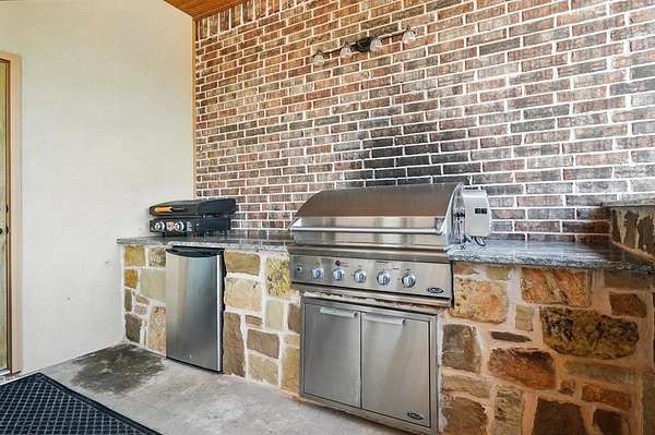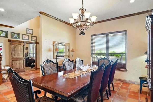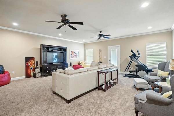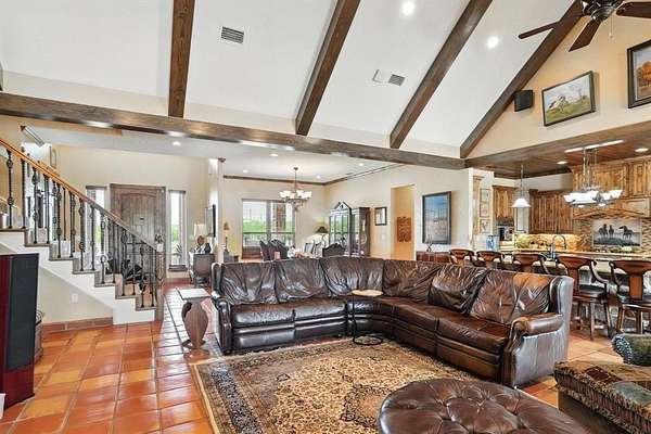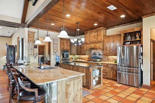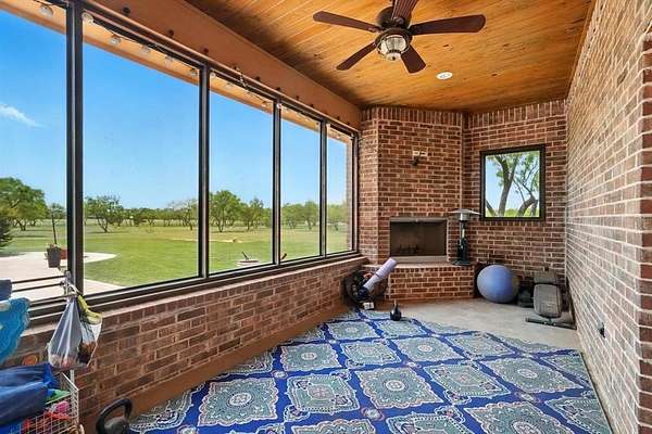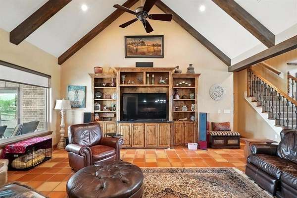 5.9 acres, pool, workshop, electric gated entrance, 3 car garage, dog kennel with mister. Interested? Keep reading, it's gets even better. Stunning gated estate with resort-style backyard and custom interior features on 5.9 acres with a circular drive, this beautifully maintained property impresses from the moment you arrive. Inside, enjoy an open floor plan designed for both daily living and entertaining. The spacious living room features a vaulted ceiling, fireplace, custom built-in, and a large picture window framing a view of the sparkling pool. The gourmet kitchen is a chef's dream with a center island and vegetable sink, gas cooktop, double ovens, granite countertops, wood plank ceiling, and stainless steel appliances. A large eat-at bar and wine bar make entertaining a breeze. The home includes a private office, a safe room, and tile and carpet throughout. The large laundry room is outfitted with built-ins, multiple counter space, and dual drying bars. The master ensuite offers a large walk-in shower, double vanities, private toilet room, and a walk-in closet with a built-in dresser. Upstairs, two bedrooms share a Jack-and-Jill bath, and a built-in desk area enhances functionality. A third upstairs bedroom has a private bath, while a fourth bedroom is currently used as a family room and fitness space with balcony views of the pool. Enjoy outdoor living year-round with a screened-in porch and fireplace, built-in gas grill, and a backyard oasis featuring a Texas shaped heated pool with slide, hot tub, and rock waterfall. A 17-zone sprinkler system keeps the grounds lush. Additional features include a 3-car attached garage to the home and the home and workshop both have spray foam insulation, two roll-up doors, covered parking, and an attached dog kennel complete with a water mister. This one-of-a-kind home truly has it all--schedule your private showing today!