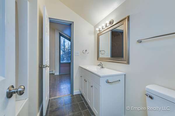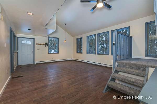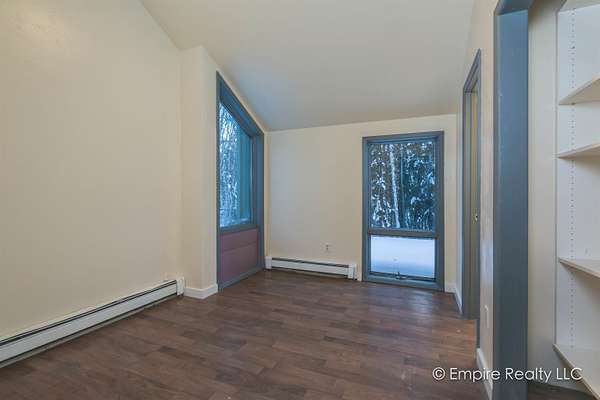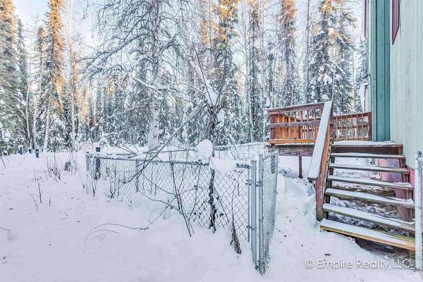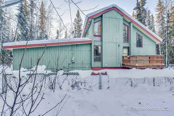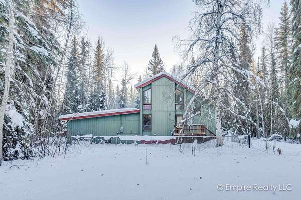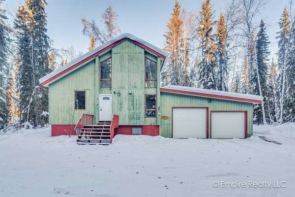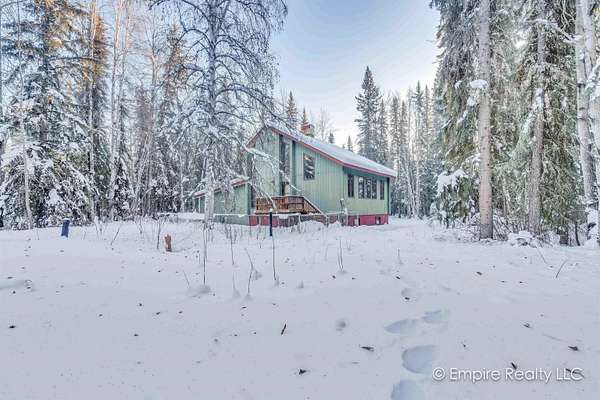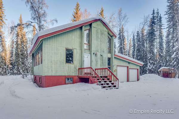 Fresh paint and flooring in this 3 bedroom, 2 bathroom, 2 car garage house on almost 2 acres. Wooded and private yet close to downtown North Pole, Ft Wainwright and convenient to Eielson Air Force Base. One garage door is tall enough for a new pickup truck, thank goodness. The upper level has two bedrooms and a jack and jill bathroom with a landing and the loft like feel compliments the vaulted ceiling of the living room. The main level includes a bedroom, bathroom, kitchen and living area and there is a daylight basement with a large family room and utility room. It may be winter now but when the snow melts the paved driveway will appear!