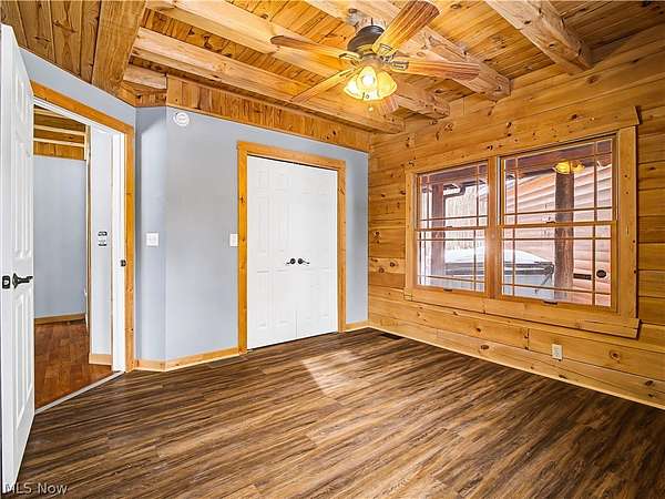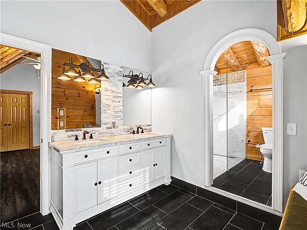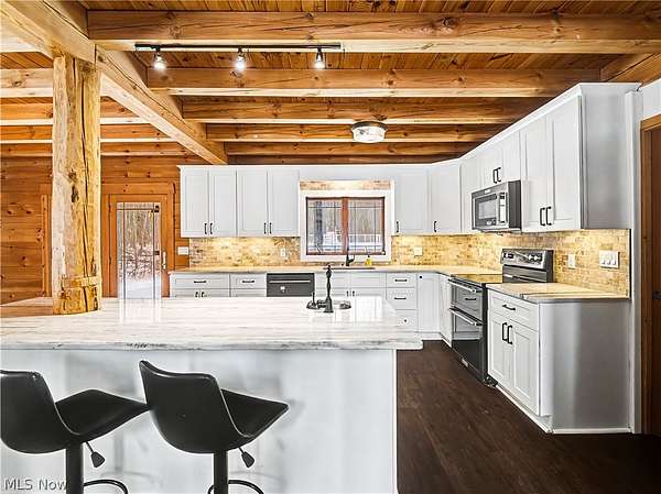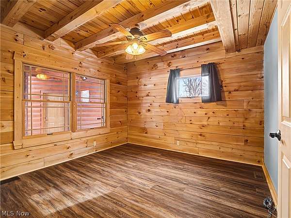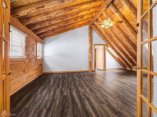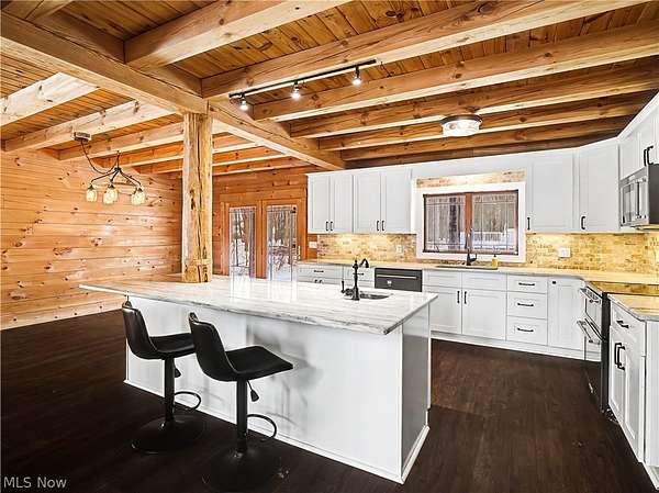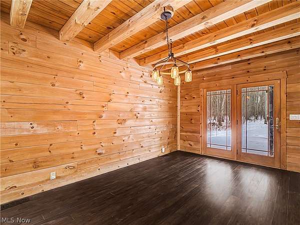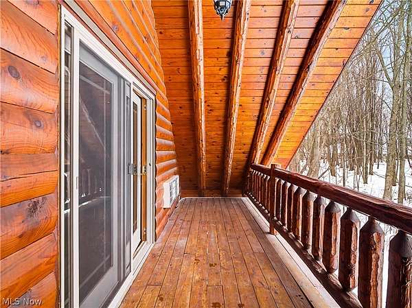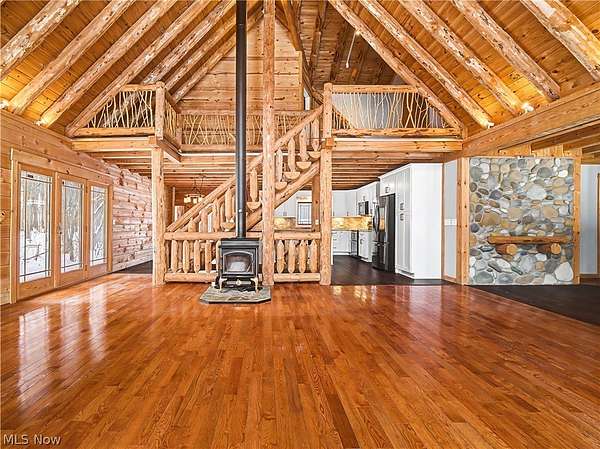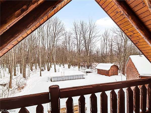 Rarely does a property like this become available in Olmsted Falls. Nestled on nearly 2 private acres with a massive three-car garage, this extraordinary log cabin estate delivers the luxury retreat you've been dreaming of-without sacrificing convenience. From the moment you enter the grand foyer, the craftsmanship is undeniable. A dramatic stone feature wall with custom built-ins, ornate staircase spindles, and soaring ceilings set the tone. The expansive family room is flooded with natural light from walls of windows, creating a warm yet breathtaking space that feels both grand and inviting. The 2023 remodeled kitchen was designed for elevated entertaining and everyday living. This gourmet kitchen is a chef's DREAM - featuring white shaker cabinetry, quartz countertops, custom tile backsplash, designer lighting, and stainless steel appliances. It flows seamlessly into the dining area perfect for intimate dinners or large gatherings. The first floor offers two spacious bedrooms, a full bath, and a functional laundry/mudroom. Upstairs, the sprawling owner's suite is a true sanctuary with a 2021 remodeled spa-inspired bath boasting a custom tile shower and glass surround. An additional bedroom with a private balcony overlooks your wooded paradise. The finished lower level is the ultimate entertainment hub-complete with a home theater, expansive bar, second living space, full bath, and abundant storage. Step outside to your private luxury oasis. The backyard overlooks peaceful woods and wildlife and features a 2024 saltwater pool, 2023 stamped concrete patio with fire wall, and a 2020 saltwater hot tub. Every detail has been thoughtfully curated to create a resort-level experience at home. A true sanctuary offering privacy, luxury, and unmatched character-just minutes from shopping, dining, and entertainment. * ROOF 2022 * FURNACE & AC 2020* NEW SUMP PUMP W/BATTERY BACK UP 2024