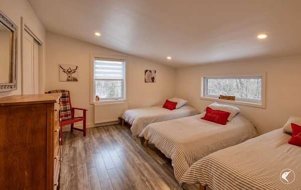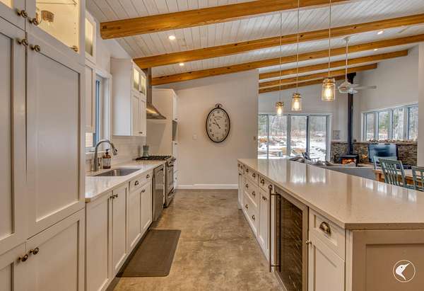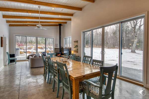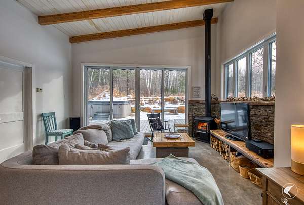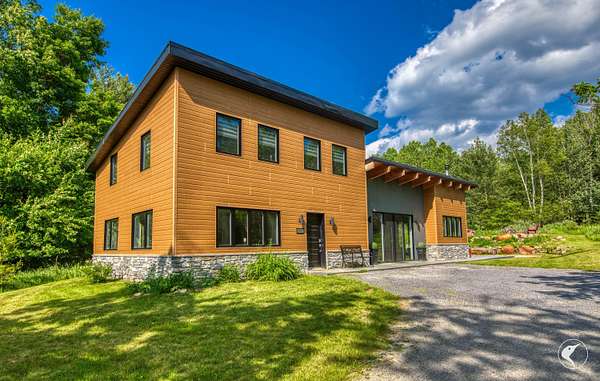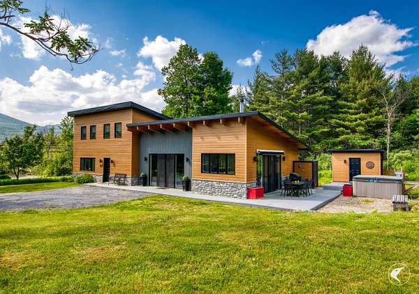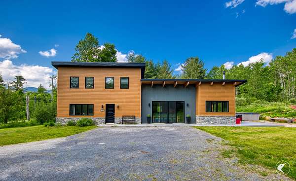 Price reduction! Located on one of Wilmingtons most picturesque and sought - after roads, this stunning contemporary mountain home offers a perfect sanctuary of modern luxury. Built with the intention of honoring the original home on the site in 1866, the newly constructed residence includes all of the reclaimed wood from the original structure to manifest this captivating, passive solar design. The open space concept for living, dining, and kitchen area has a soaring pitched ceiling with recessed lighting and exposed beams plus an innovative modern kitchen with an expansive island and stainless appliances. The entrance vestibule offers plenty of space for sports gear, skis, bikes and all of your outdoor equipment. There is also a spacious TV room just steps away from the first floor primary bedroom and full bathroom with modern tile shower. The second level has 2 bright, sizable bedrooms and a full bathroom. Currently a dormitory space on the landing is used for a sleeping area that could also be an efficient office space. Built with commendable thought and maximal sustainable intentions, this home, sitting due south collects a natural heat source warming concrete floors through expansive doors and windows. The exterior, CanExel siding and Trex decking, perfect for the most severe elements. Accompanying these mindful features, is an outdoor shower and tub spa. This awe inspired home is being sold with all furnishings together on a 2 acre parcel! Call today to see this unparalled masterful home.