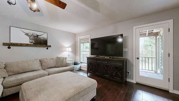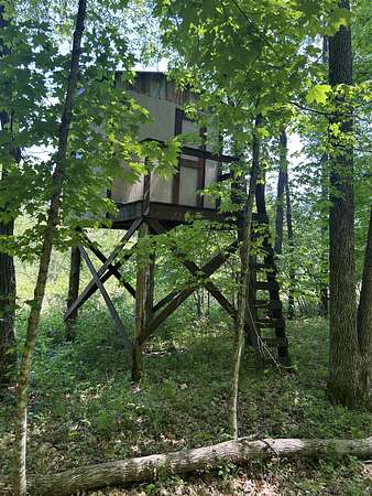 A standout feature is the elevated treehouse with deck perfect for kids, entertaining, or enjoying the natural setting. It can also serve as a permanent deer blind, offering a unique opportunity for hunting or wildlife observation.