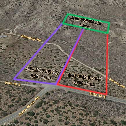Hwy 138 to 106th Ste. Turn towards mountains. Continue past Ft. Tejon to Cima Mesa. Turn right and continue to 96th Ste.