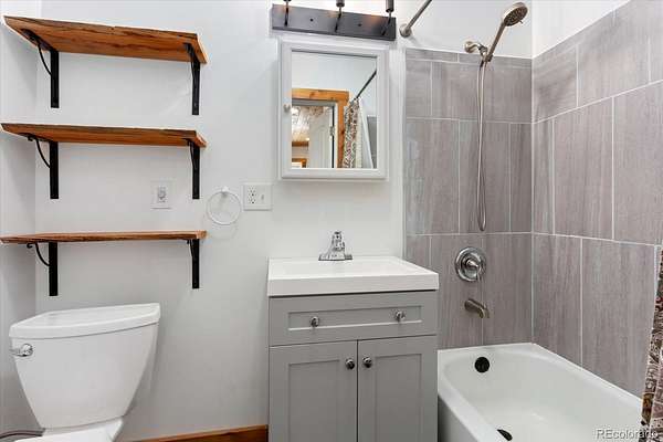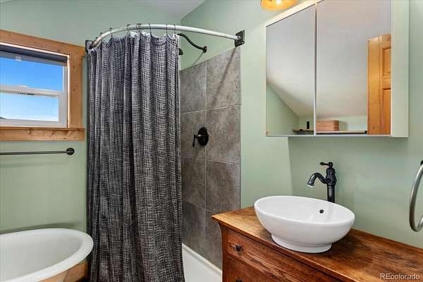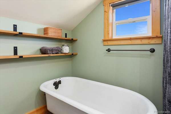 The main residence features tongue-and-groove vaulted ceilings and perfectly placed windows that frame incredible views of the Twin Sisters peaks. A cozy wood-burning stove anchors the open-concept living space. Finishes include stained concrete floors on the main level and a second-floor primary suite with luxury vinyl plank flooring, a classic clawfoot tub, and a spacious landing area ideal for a home office or sitting area. The kitchen offers beautiful cabinetry and a Hevea butcher block island, supported by radiant in-floor heat powered by a high-efficiency Navien boiler.