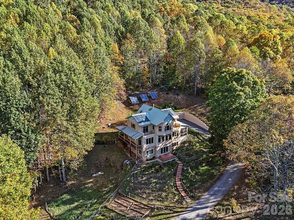 Casa Solara | Off-Grid Mountain Living Just 4 miles north of Black Mountain, Casa Solara is a fully off-grid, passive solar home on 11 private acres with long-range mountain views. Offering 3,868 SF, the home includes 3 bedrooms and 3 baths. The main level features an open living, kitchen, and study area with radiant floor heat, a propane stove, curved architectural walls, and expansive windows that capture natural light and views. Upstairs, two bedrooms open to a private balcony and share a spacious bath, along with a bright yoga/sunroom. The walk-out lower level includes a bedroom, bath, media room, bonus space, and utility/battery room. Designed by Alice Dodson and built by Mark Bondurant, this thoughtfully crafted residence blends sustainable design with comfort and functionality. Built for performance, the south-facing orientation maximizes solar gain, while 12-inch concrete walls (R-17) provide thermal mass and natural climate control. The off-grid system includes a 3.6 kW photovoltaic array, Outback inverter, 48 industrial batteries, and solar thermal for hot water and radiant heat, with a Kohler propane generator backup. Private well and 3-bedroom septic in place. Outdoor features support a self-sufficient lifestyle with terraced gardens, a 1,550-gallon rainwater collection system for irrigation, and established fruit trees (peach, Asian pear, persimmon). Additional structures include a woodworking shop, storage cabin, and chicken barn. Potential for additional homesites. This is a rare and special property. If you are looking for beauty and off grid living, this is your home.