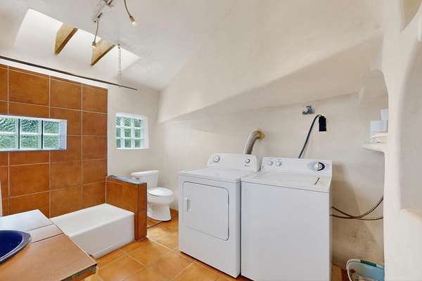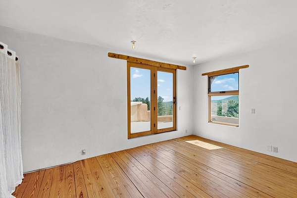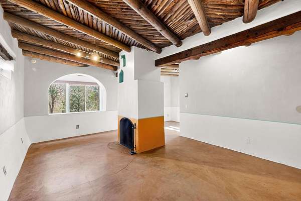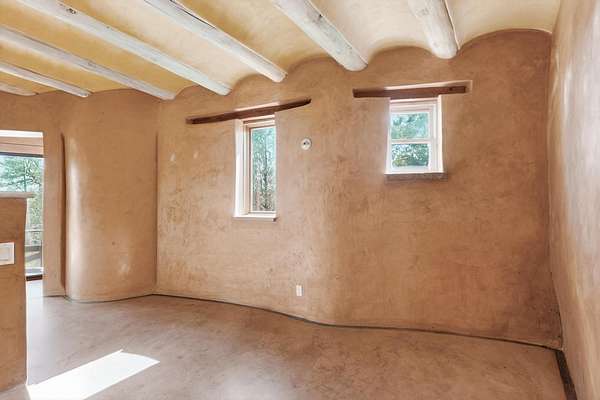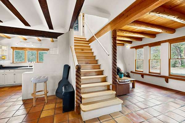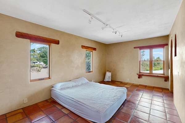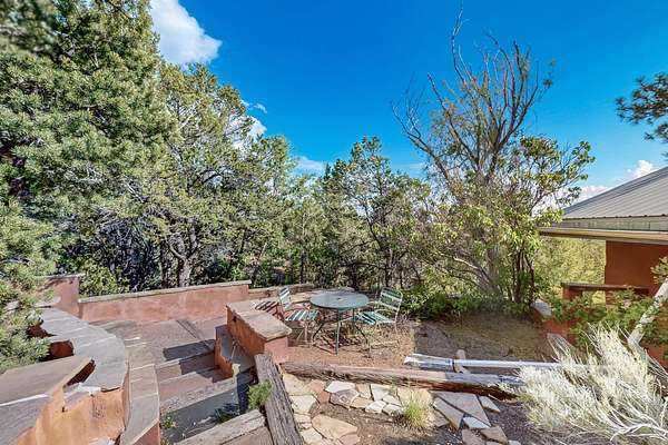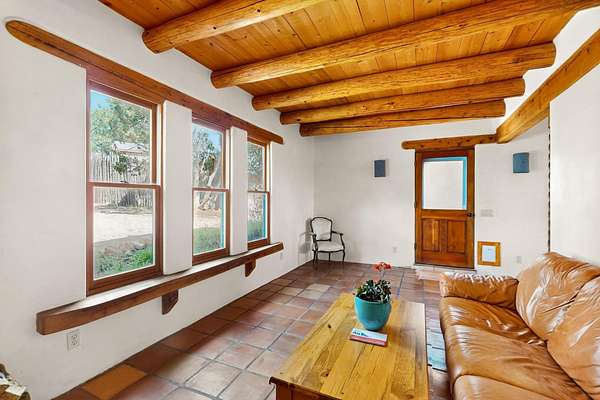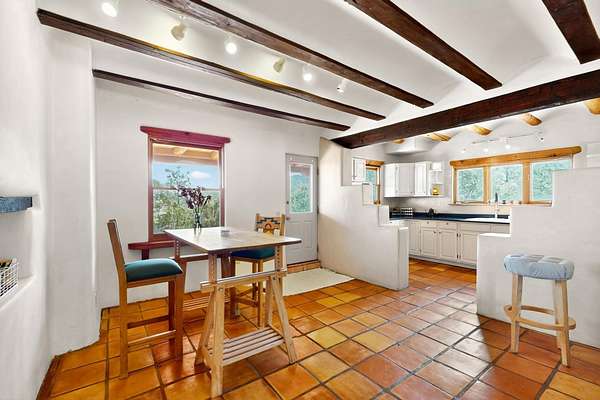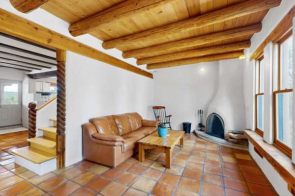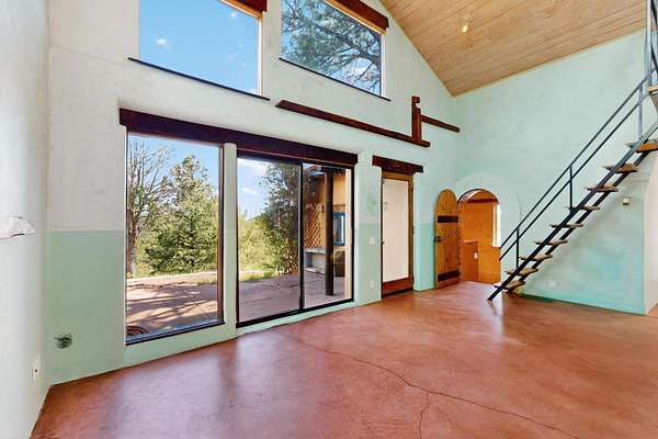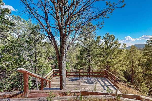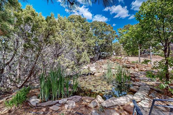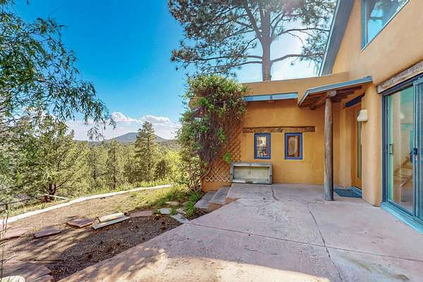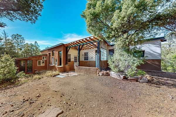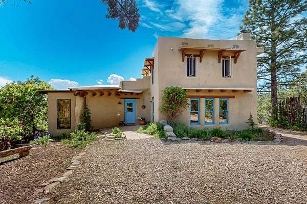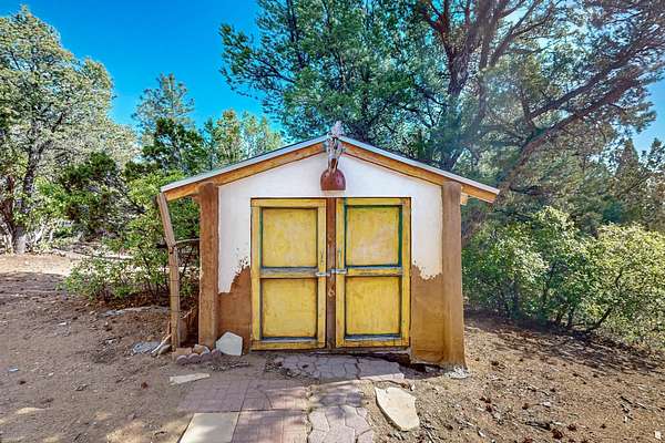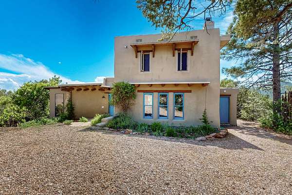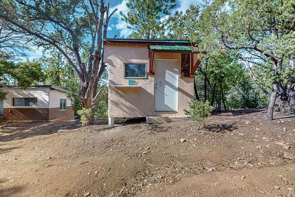 Two houses reside on this beautiful 5 Acre property that is nestled among old growth pine trees, offering numerous possibilities and conveniently located about 20 minutes from town The property features two distinct homes and a studio/workshop, all within a peaceful natural environment. House #A includes 2 bedrooms, 1 bath, fireplace, stained concrete floors, hard trowel plaster walls, radiant heat, a loft, and vigas, and a private deck. House #B known as the "Lily Pad House" offers 3 bedrooms, 2 baths, fireplace, saltillo tiles, vigas, radiant heat, hard trowel plaster, wood floors, vigas, spacious kitchen, portal, and delightful koi pond with lilies. Additionally, there is a versatile studio/workshop, consisting of an enclosed vintage travel trailer perfect for guests, and an attached site-built studio/workshop, providing multiple potential uses. The property also benefits from a private well, storage sheds, and no Homeowners Association.