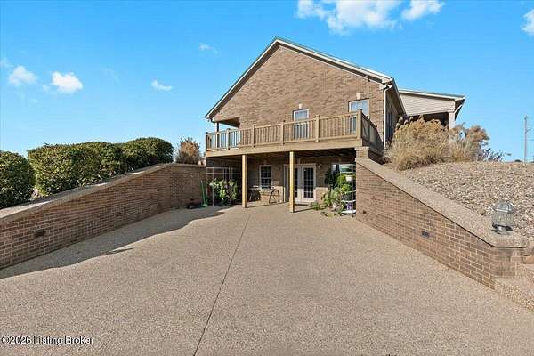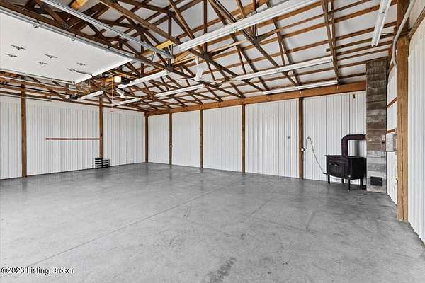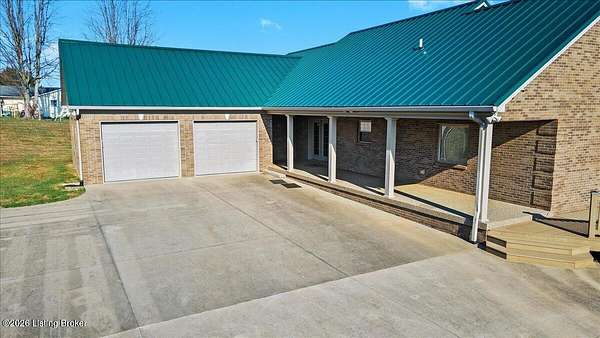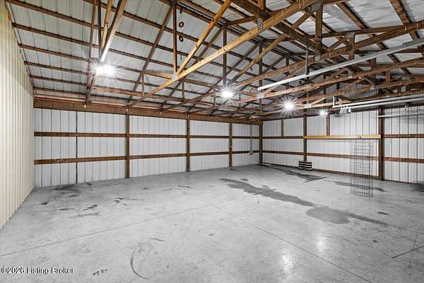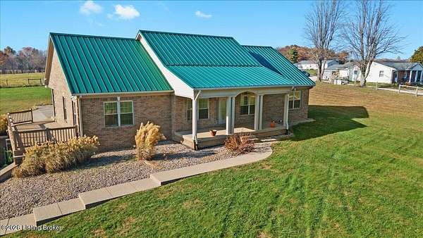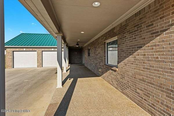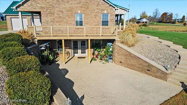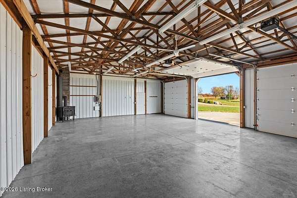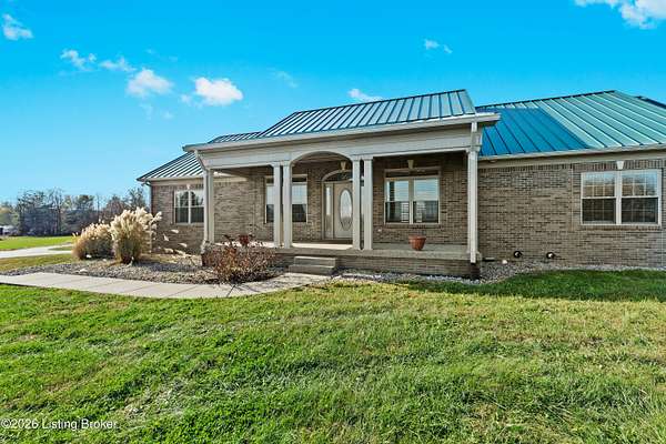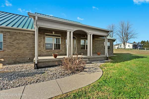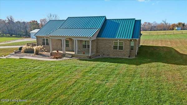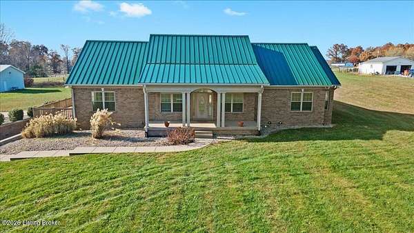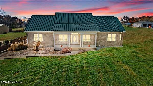 This custom brick ranch home offers over 4,000 square feet of finished living space and is thoughtfully positioned on 5.5 fully fenced acres featuring two stocked ponds, multiple shop buildings, and an all-concrete driveway-a rare combination of acreage, privacy, and functionality. Built in 2007 with 2x6 exterior walls, this home was designed for durability and energy efficiency, featuring geothermal heating, a 3-zone HVAC system, and a tankless hot water heater. The property is also wired for a security system, providing added peace of mind for homeowners seeking both comfort and long-term value. The main level spans 2,068 square feet and showcases a highly desirable open-concept floor plan ideal for everyday living and entertaining. The kitchen is the heart of the home, highlighted by real hardwood flooring, solid white oak cabinetry, granite countertops, stainless steel appliances, a large center island with raised bar seating, and a walk-in pantry. Additional features include a double oven, flat-top cooktop, and vented hood system, making this kitchen both functional and timeless. The kitchen flows seamlessly into the spacious living area, creating a warm and inviting central gathering space. The main floor includes three bedrooms and two full bathrooms, along with a tiled laundry room for convenience. The primary suite offers a private retreat with a tray ceiling, oversized walk-in closet, double vanity, jetted soaking tub, and a walk-in tile shower. Secondary bedrooms feature comfortable layouts with plush carpeting, while bathrooms and laundry areas are finished with durable tile. The fully finished walkout basement significantly expands the living space and versatility of the home. This level features a large recreation and entertainment area with built-in surround sound, a bar area, a spacious bonus room suitable for a home office, gym, theater, or additional living space, and a third full bathroom. Two oversized unfinished storage rooms provide exceptional storage options, including one secured with a fireproof safe door and combination lockideal for valuables, equipment, or important documents. Double patio doors lead to a generous concrete patio, enhancing indoor-outdoor living. Exterior features include a metal roof, covered concrete front porch, covered concrete back patio, and an attached two-car garage. For hobbyists, business owners, or those needing extensive workspace, the property includes two detached shop buildings with concrete floors, electric, and water: a 40x30 three-bay shop and a 30x60 four-bay shop, offering exceptional flexibility for storage, equipment, or vehicles. With 5.5 fenced acres, two stocked ponds, and a peaceful rural setting, this property delivers the space, privacy, and versatility today's buyers are actively searching forwhile remaining conveniently located just 5-20 minutes from Elizabethtown, Fort Knox, Rineyville, and Radcliff. This home represents quality construction, energy efficiency, expansive living space, and unmatched shop capabilitya rare opportunity for those seeking a move-in-ready home with acreage built to last.