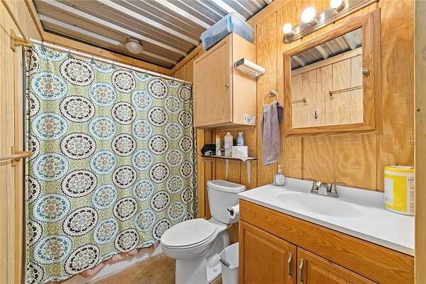 Barndo 2: 900 Sq. Ft., 2 Bedroom, 1 Bath with attached screened in porch on the East and West side. Attached Conex to the patio includes 2 bunk beds and a full-sized bathroom. Bardo 2 has its own standard septic system. Includes a large awning on the North side of the building. East side of the Conex has extra room for shop tools, a closet, etc.