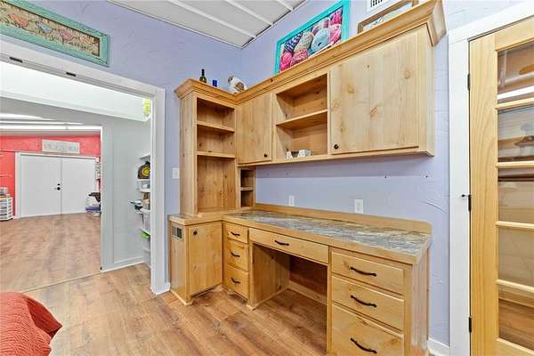 The master bath features a walk-in closet that also serves as a safe room-storm shelter. Additional improvements include an attached insulated shop (approx. 856 sq. ft.) with heat and air, attached 3-car garage (approx. 1,000 sq. ft.), large screened-in porch (approx. 975 sq. ft.), screened dog kennel, and 10' awnings on the north and south sides of the home. Built-in wood-burning stove in living room. Corrugated metal roof and exterior for durability and low maintenance.