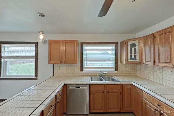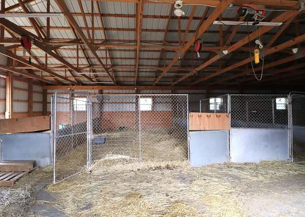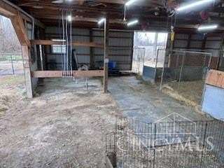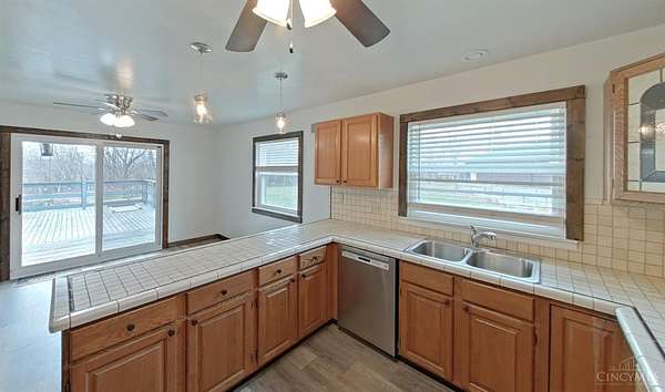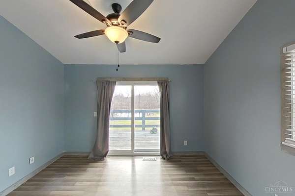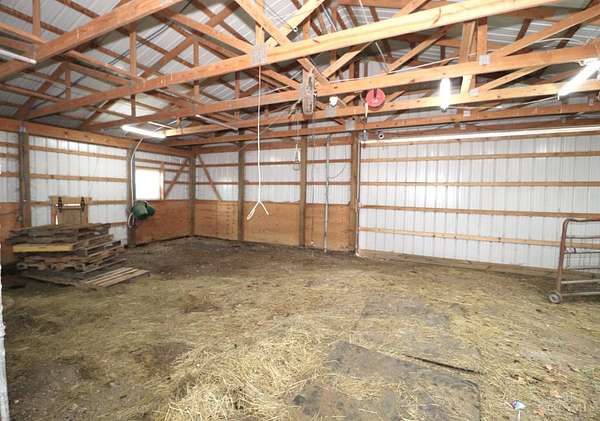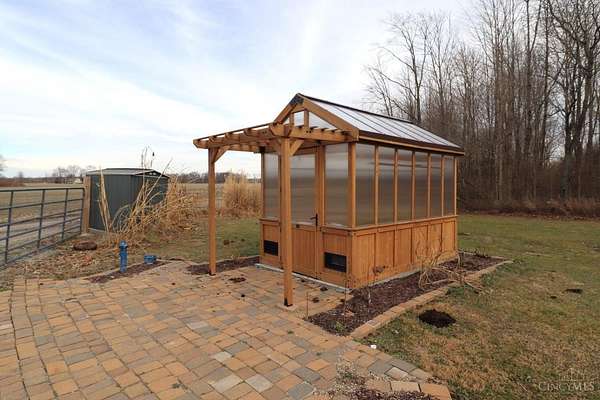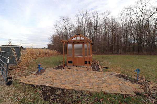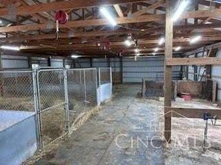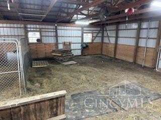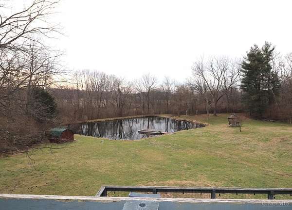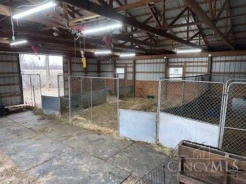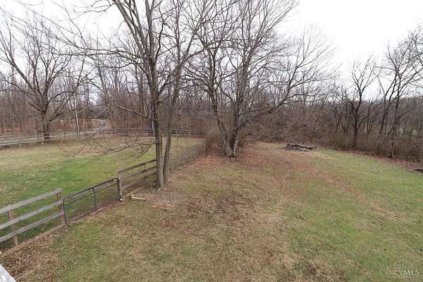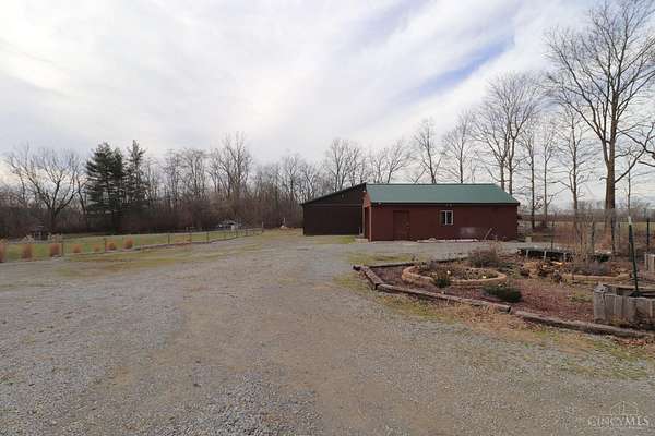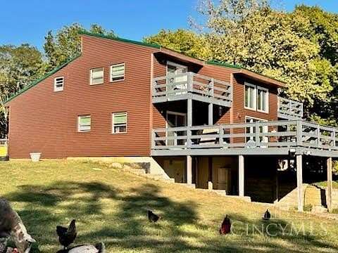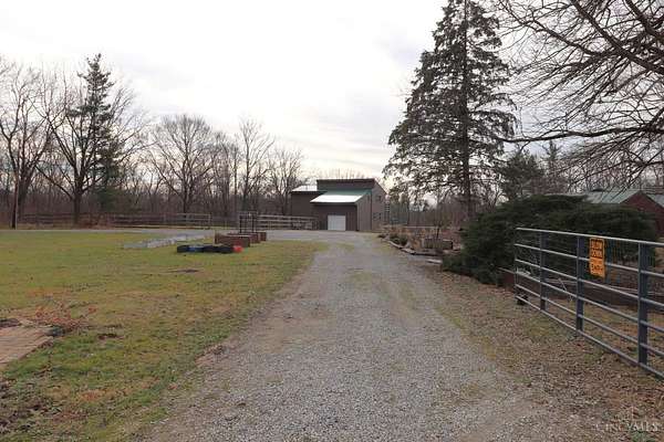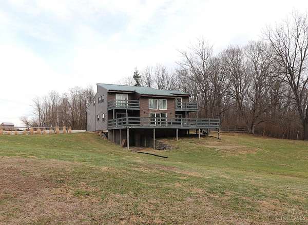 Private 14.65-acre retreat set 1/4 mile off the road in Blanchester. This 4-bedroom, 2-bath home features a first-floor primary suite, loft overlooking the living room, and a full unfinished walk-out basement. Major 2024-2025 updates include metal roof, windows, siding, flooring, paint, and upgraded upstairs bath. Kitchen offers oak cabinets, tile counters, stainless appliances, and new 2025 double oven. Cathedral ceilings and expansive decks and balconies. Advanced home automation includes smart curtains, multi camera, lighting, locks, and garage door. Generator hookup with interior transfer switch. One-car attached garage and multi-fenced yard. Property includes pond with fountain and dock, 40x60 livestock barn with electric, heated water system, and adjustable pens, detached workshop with HVAC and water, fiber internet to all buildings, circular drive, ATV trails, deer stand, gun range, two greenhouses with water, herb garden, fruit trees and berries.