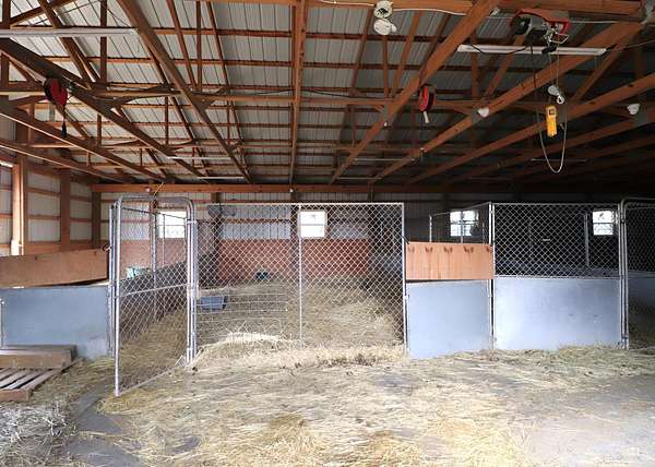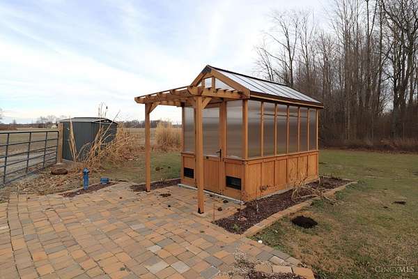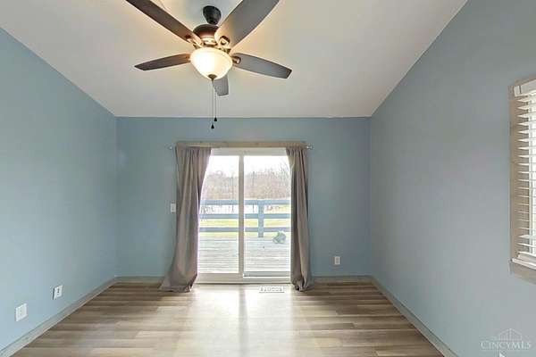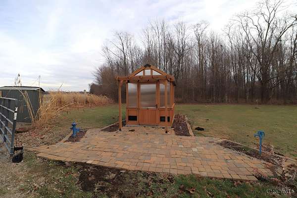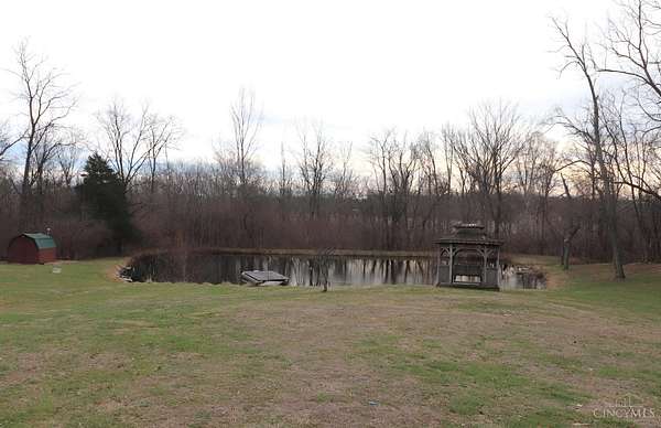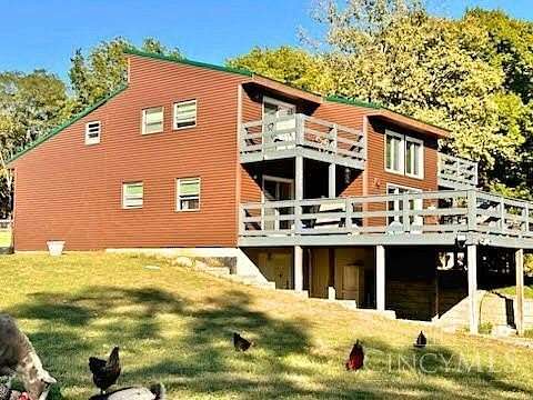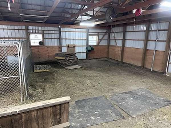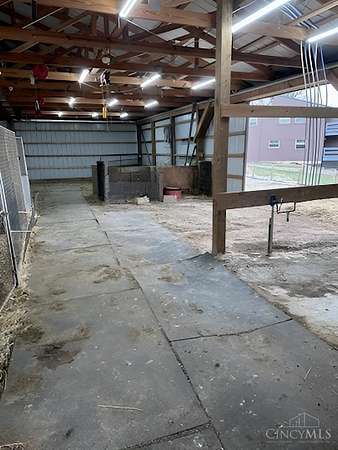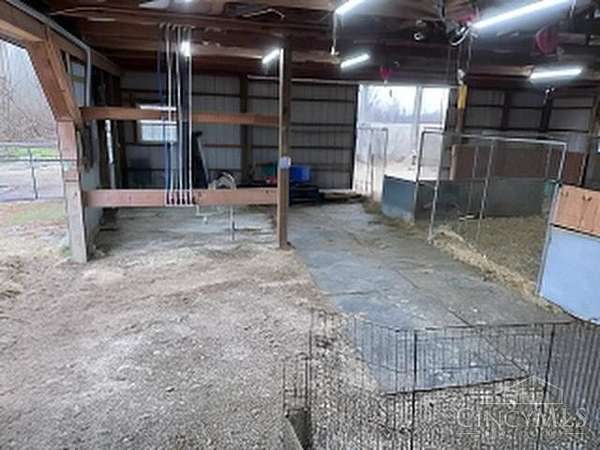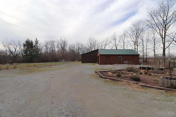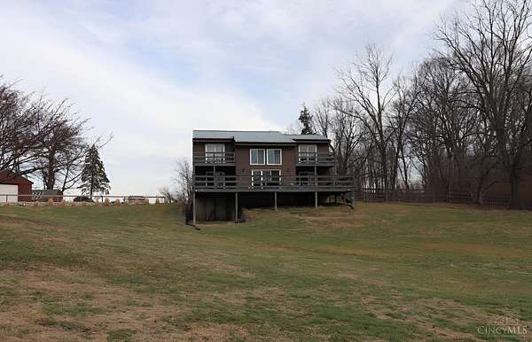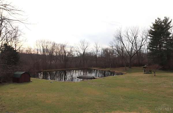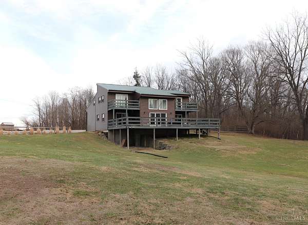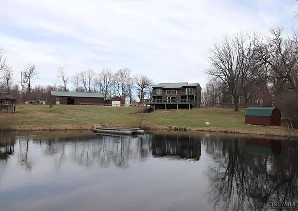 Perfect homestead or mini farm opportunity! Private 14.65-acre retreat set 1/4 mile off the road in Blanchester. This 4-bedroom, 2-bath home features a first-floor primary suite, loft overlooking the living room, and a full unfinished walk-out basement. Major 2024-2025 updates include metal roof, windows, siding, flooring, paint, and upgraded upstairs bath. Kitchen offers oak cabinets, tile counters, stainless appliances, and new 2025 double oven. Cathedral ceilings and expansive decks and balconies. Advanced home automation includes smart curtains, multi camera, lighting, locks, and garage door. One-car attached garage and multi-fenced yard. Property includes pond with fountain and dock, 40x60 livestock barn with electric, heated water system, and adjustable pens, detached workshop with HVAC and water, fiber internet to all buildings, ATV trails, deer stand, gun range, two greenhouses with water, herb garden, fruit trees and berries.
