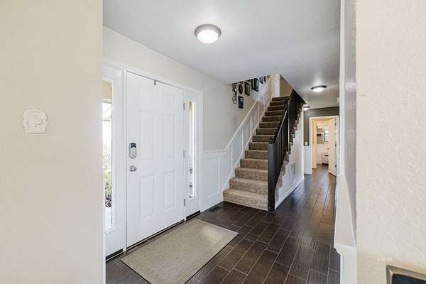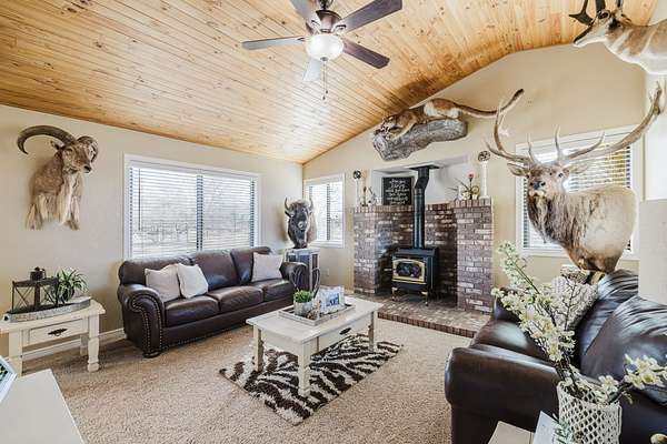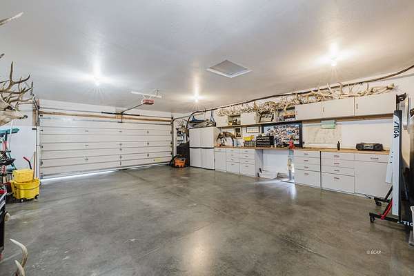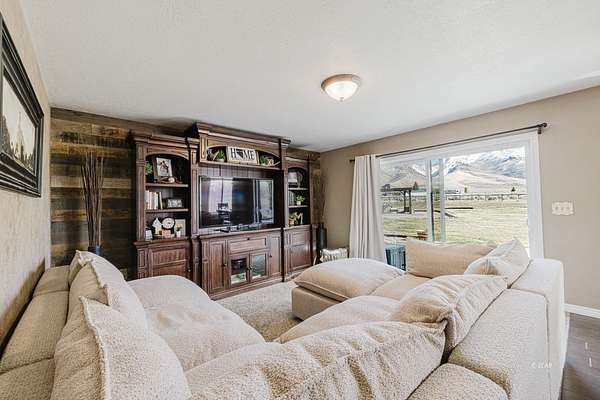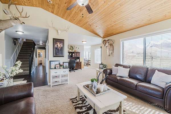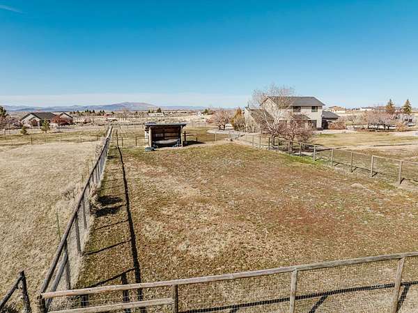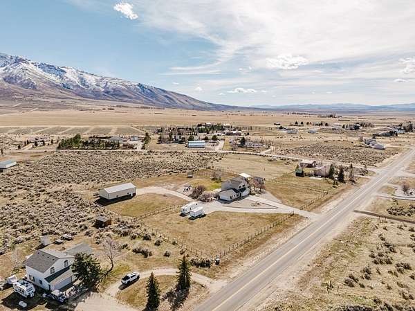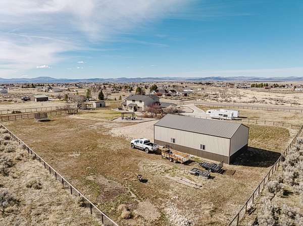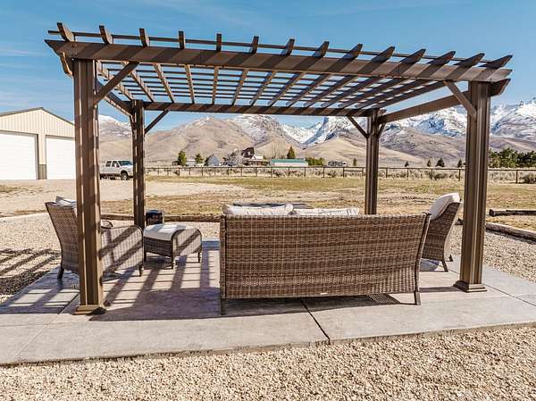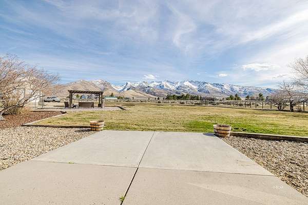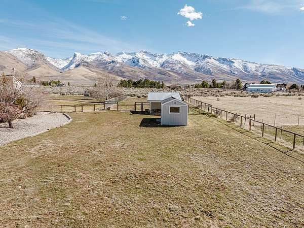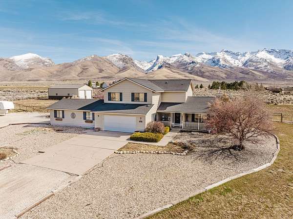 The view of the Ruby Mountains just can't be beat! This move in ready home has 4 bedrooms, 2.5 baths and sits on 2.46 acres. As you enter the home, the comfortable family room features a natural gas fireplace for efficient warmth. Enjoy a functional floor plan with distinct kitchen, dining, and living areas. Laundry room and 1/2 bath are present on the main floor. There are dual two-car garages, connected by an adjoining door. The upper level features four bedrooms and two full bathrooms, providing a comfortable sleeping area separate from the main living spaces. Outdoor living under the charming pergola is perfect for relaxing evenings or entertaining guests. The property also includes a separate fenced area ready for gardening or animals, complete with a lean-to and storage shed, making it ideal for hobby farming or projects. The expansive 1,500 sq. ft. shop with a durable cement floor is ideal for storage, or workspace.