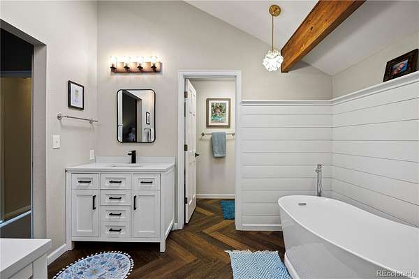 The spacious primary suite offers vaulted ceilings, a private balcony, walk-in closet, and an updated bath with double vanity and freestanding soaking tub. Additional bedrooms offer flexibility for guests, offices, or hobbies, with several providing direct outdoor access.