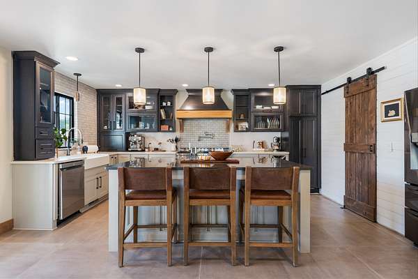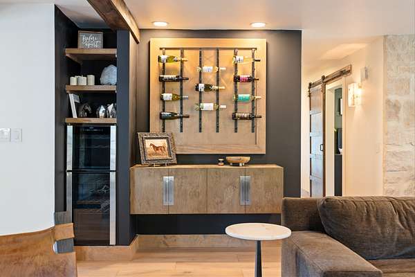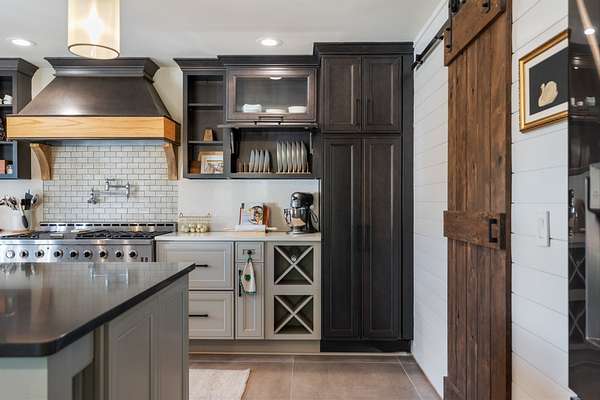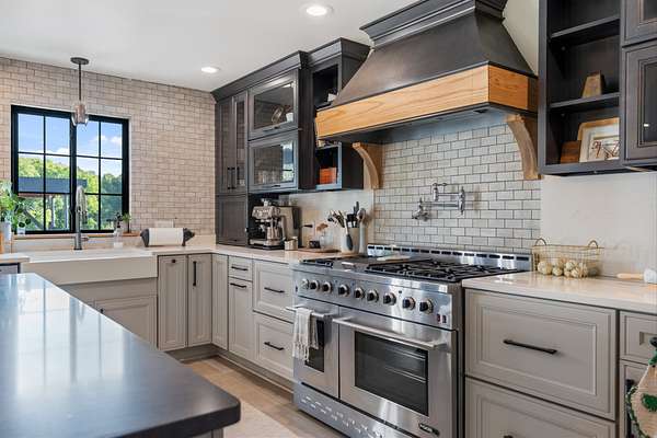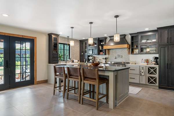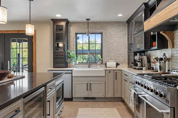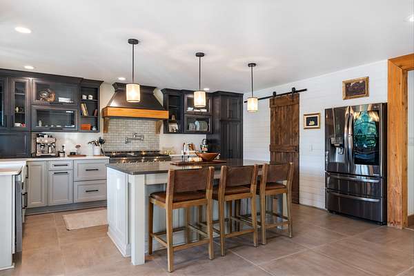 A chef's dream kitchen with a 6-burner gas range, waterfall coffee bar, wine bar with dual refrigerators, and custom finishes throughout.