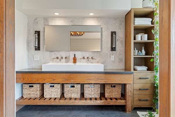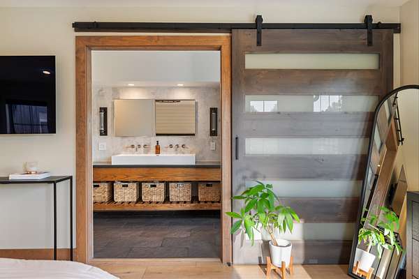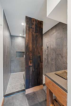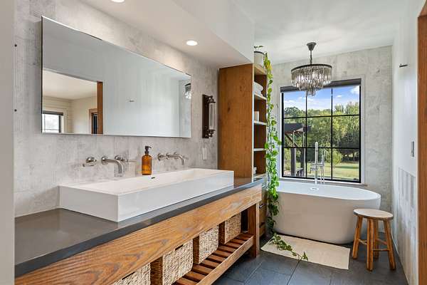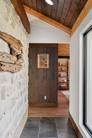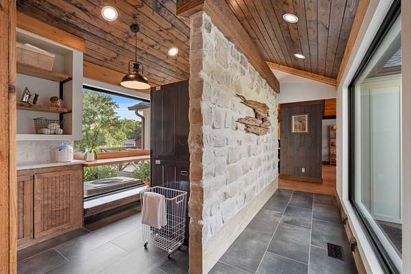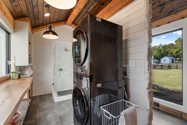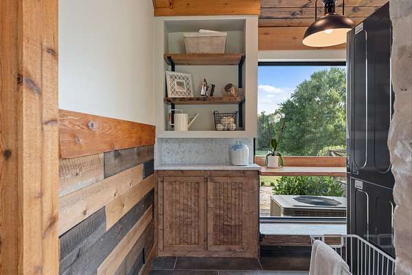 Cedar accents, two cozy gas fireplaces, and spa-inspired bathrooms with oversized rain-shower retreats create an everyday atmosphere that feels like a boutique hotel. Even practical spaces shine like the live-edge laundry shelf overlooking your acreage and a custom dog-spa bath your pets will love.