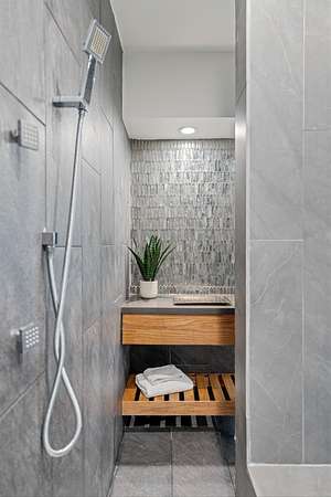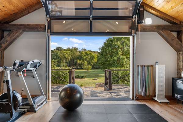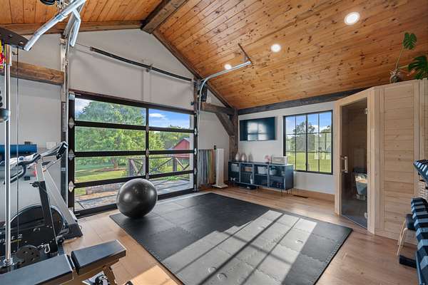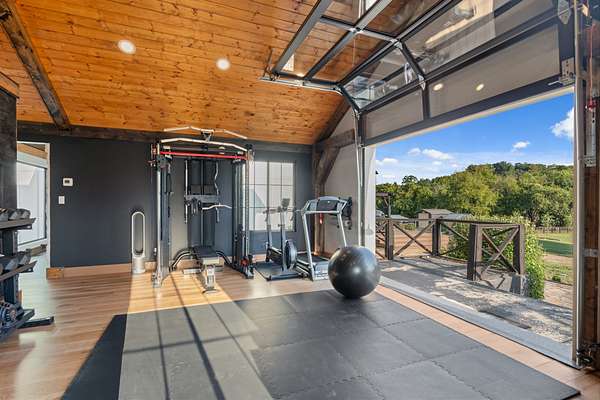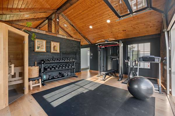 A private home gym with floor-to-ceiling custom glass doors opening straight to the backyard & Sauna.