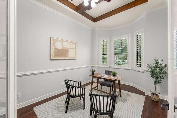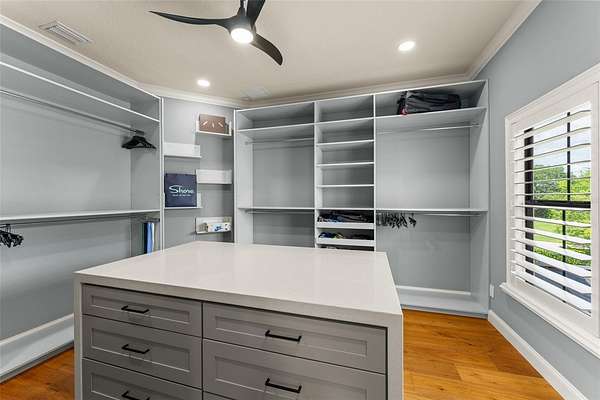 - Built-In Features, Ceiling Fans(s), Coffered Ceiling(s), Crown Molding, Eat-In Kitchen, High Ceilings, Kitchen/Family Room Combo, Open Floorplan, Primary Bedroom Main Floor, Primary Bedroom Upstairs, Solid Wood Cabinets, Stone Counters, Walk-In Closet(s), Window Treatments
