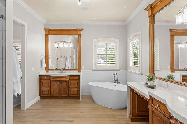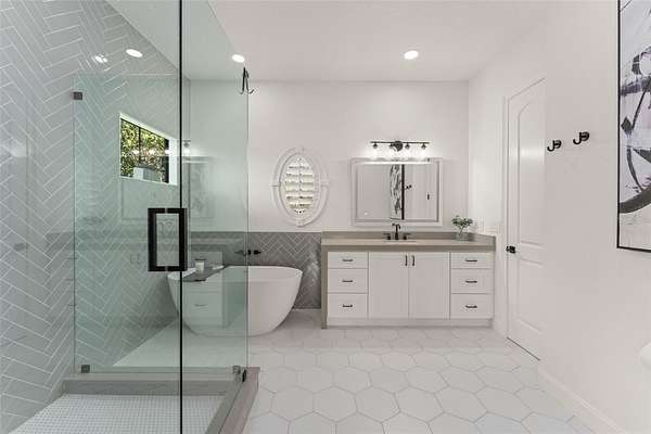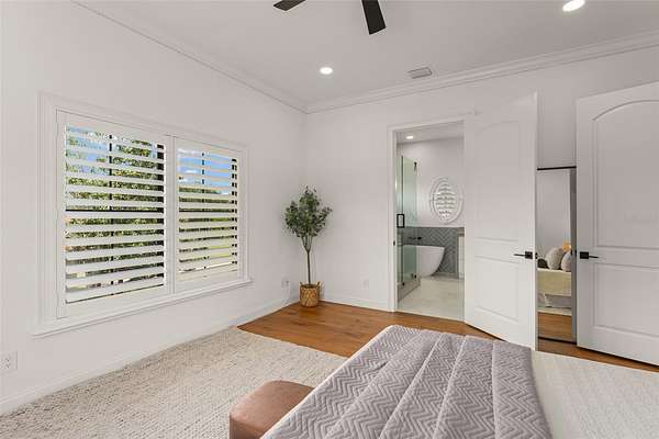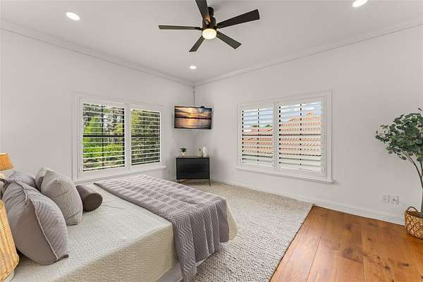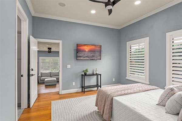 The primary suite is a true retreat, featuring a private balcony overlooking the tranquil backyard and lake. A dedicated lounge with a beverage bar, updated spa-inspired bathroom, and custom walk-in closet create a refined and relaxing escape. Every bedroom is an ensuite, providing exceptional comfort for family and guests, while two fully remodeled junior suites showcase modern bathrooms and expanded custom closets.