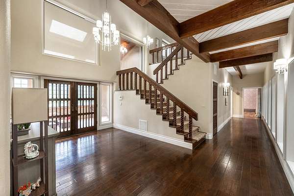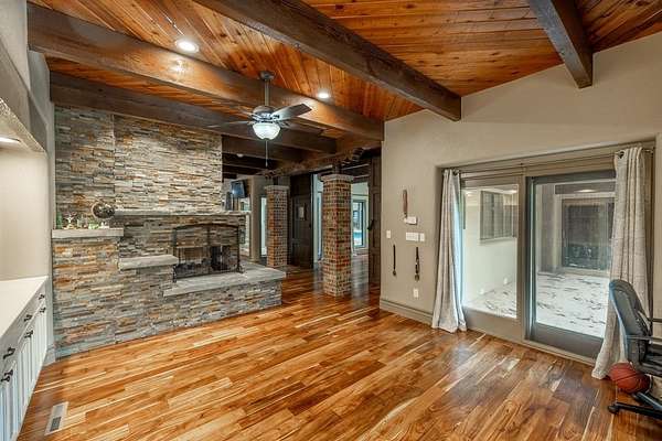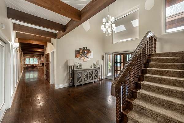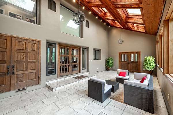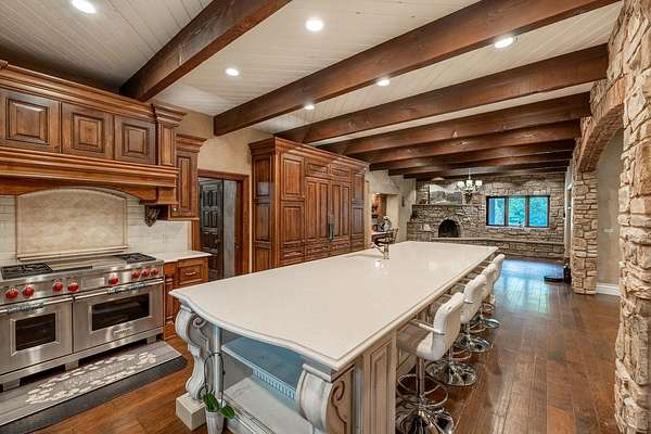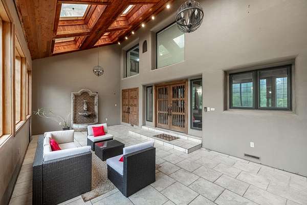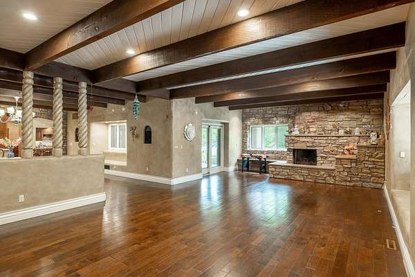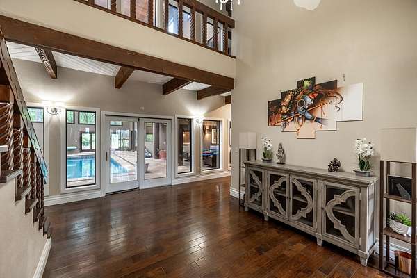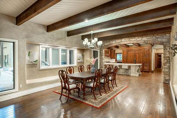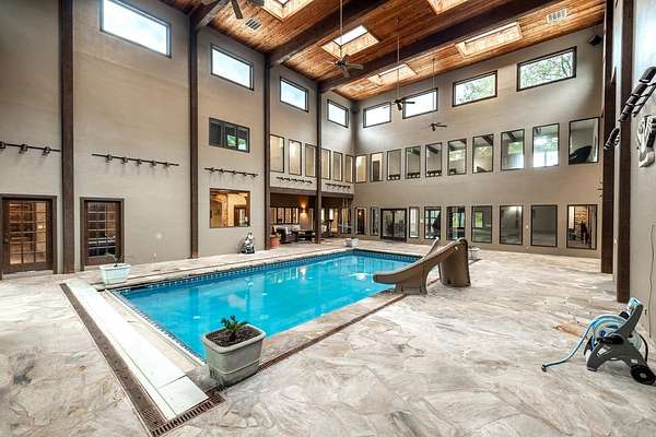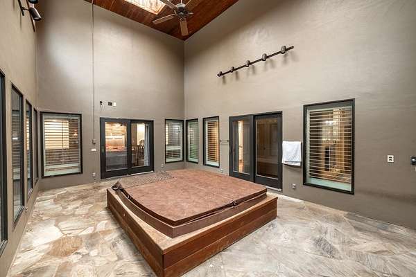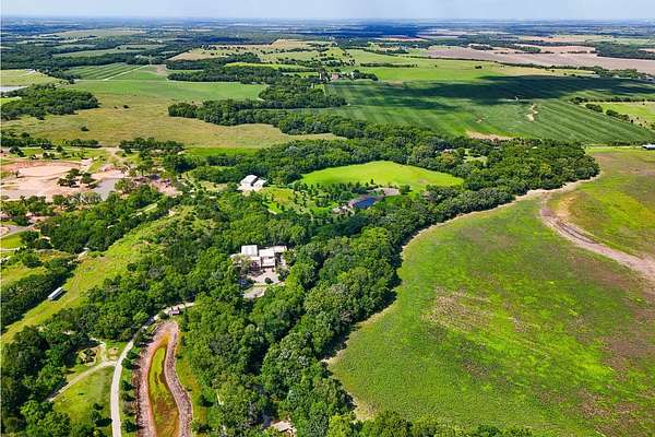 Welcome to a truly exceptional estate located between Andover and Augusta, offering privacy, space, and sophistication just off HWY 54. This 32+/- acre property is easily accessible and features a paved drive leading to an impressive 11,914+/- square-foot custom home. With a warm Southwestern architectural flair, the residence is surrounded by mature trees and professionally designed landscaping. This stunning estate is built for both grand entertaining and everyday living. The home welcomes you with a striking sunroom-style entry featuring double doors and soaring ceilings. Inside, the elegant foyer is accented with wood-beamed ceilings and sleek hardwood floors. The expansive living room includes a beautiful stone fireplace and a convenient butler's pantry, while the formal dining room is ideal for hosting guests. The chef's kitchen and hearth room boast a massive island, quartz countertops, a farm-style sink, integrated refrigerator, and premium appliances. There are three-plus spacious bedrooms, each with walk-in closets, along with four full bathrooms. Additional interior features include a spectacular indoor pool and entertaining area with a hot tub and tall ceilings, a private theatre room, a second-level loft with balcony, and two laundry rooms. The home also offers multiple covered patios, abundant parking, and an attached two-car garage. The estate includes two large heated metal outbuildings. One measures 40 by 80 feet with two overhead doors, and the other is 35 by 50 feet with split siding doors. Each building is equipped with a bathroom. Outdoor features include a scenic pond and creek, additional water features, a brick-paved entertaining area, an irrigation and drinking well, and a septic system. This property offers unmatched amenities and flexibility for a variety of lifestyles. It must be seen in person to be fully appreciated. Please note that Butler County records do not accurately reflect the real estate being sold. A 1.5-acre parcel previously identified as owned by the seller is not included in the sale. Certain marketing videos may still reflect this parcel at the far south end of the property. However, the correct property boundaries are clearly shown in the included survey and updated maps within the property information packet. Buyers are encouraged to review all materials carefully. Buyer should verify school assignments, as they are subject to change. All information is deemed reliable but not guaranteed.