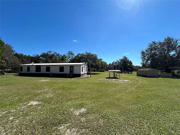 5-bedroom, 3-bath manufactured home on 5.02 acres in Polk City. This 1,836 sq ft home offers an open floor plan, a large kitchen, and plenty of natural light. The property includes mature trees and open land. Located on SR 33 with easy access to main highways. Includes a 13 ft x 27 ft front patio, an adjacent awning for vehicles, and a shed. There is also an unused well in the north east section of the property.