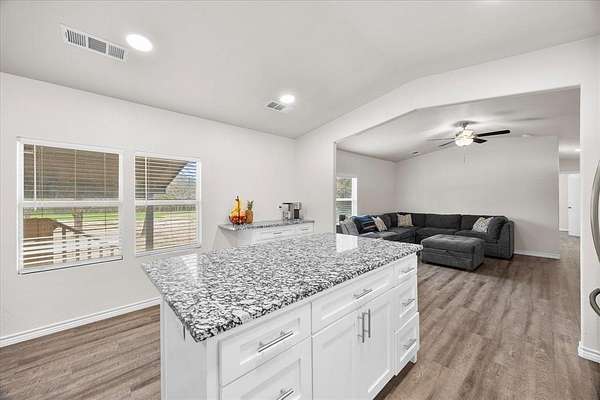 - Decorative Lighting, Eat-In Kitchen, Granite Counters, Kitchen Island, Open Floorplan, Pantry, Walk-In Closet(s)