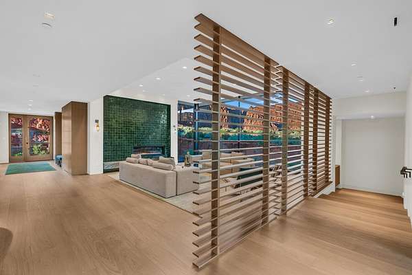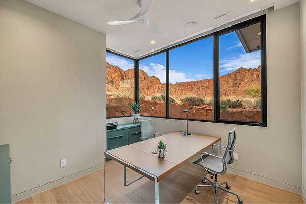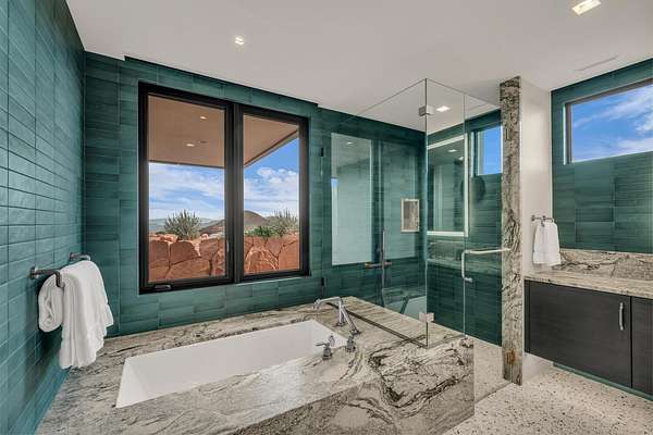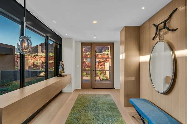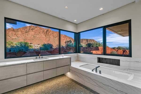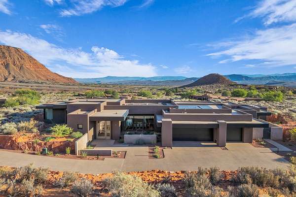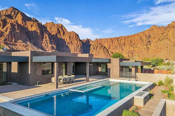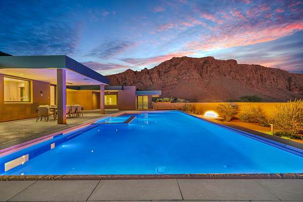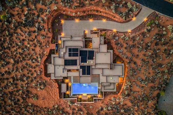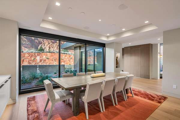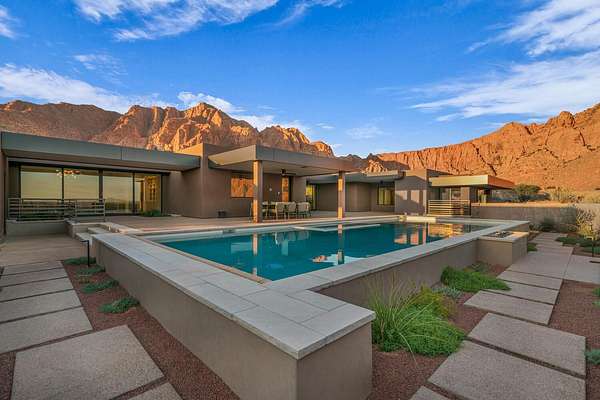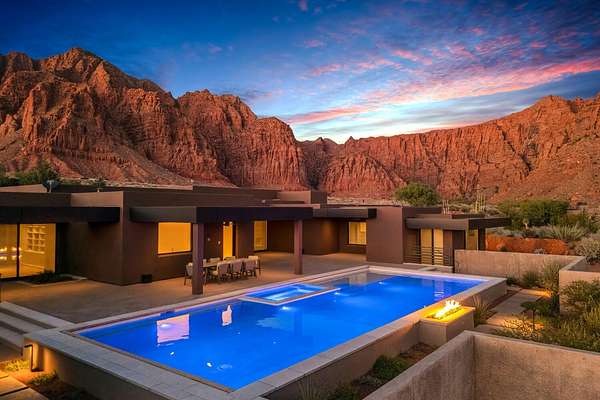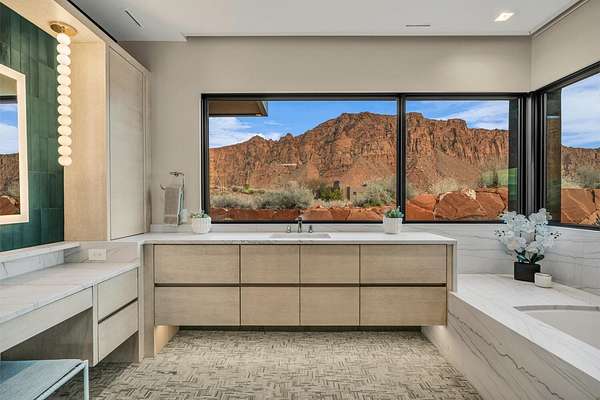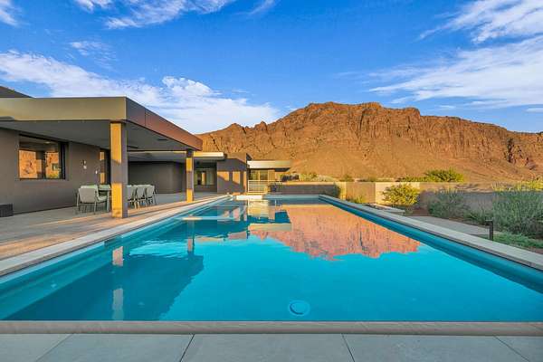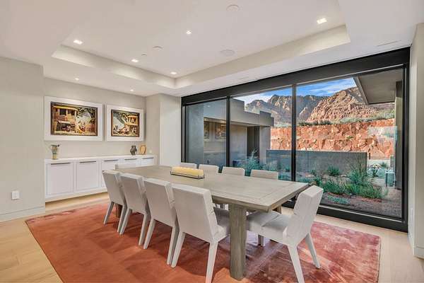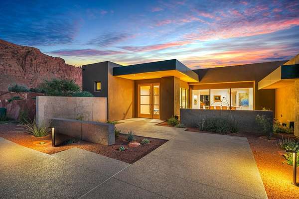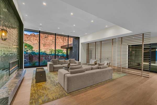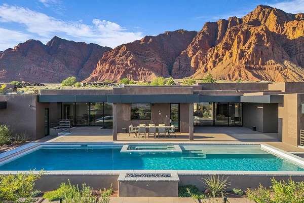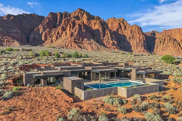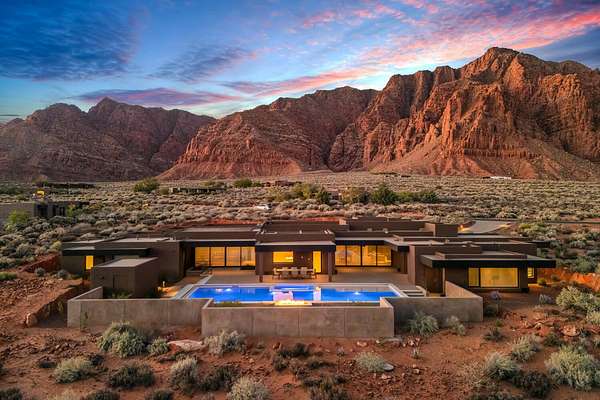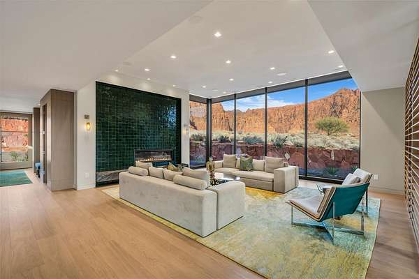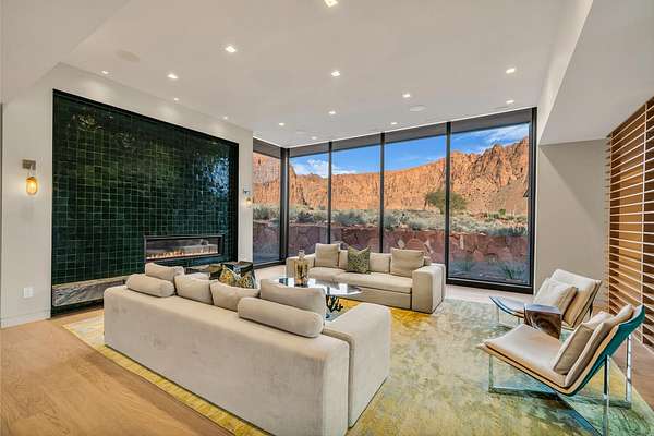 As seen in Architectural Digest, this design-forward desert residence is set against the breathtaking red cliffs of Kayenta, where contemporary architecture and the surrounding landscape exist in quiet harmony. Interior design by KSA Design Group in Chicago brings a refined sensibility to every space, creating a residence that feels both sophisticated and deeply connected to the natural beauty that surrounds it. Expansive walls of glass frame the ever-changing colors of the desert sky and sandstone cliffs, blurring the boundary between indoors and out. Clean architectural lines, organic materials, and a restrained natural palette create interiors that feel calm, grounded, and quietly elegant. At the heart of the residence, the thoughtfully designed living room - showcased in Architectural Digest - features a striking tiled fireplace wall inspired by the surrounding desert landscape. Rich textures and a nuanced green glaze echo the tones of the cliffs and vegetation beyond the expansive window wall, creating a dramatic focal point that brings the beauty of the desert directly into the interior. Designed for both connection and retreat, the open layout flows naturally between gathering spaces and private areas. Mornings begin with coffee as the rising sun washes the red cliffs in warm light, while evenings invite conversation beside the fire as the desert sky deepens overhead. The spa-inspired primary suite includes a dedicated yoga and exercise studio, creating a serene setting for wellness and restoration, while two ensuite guest rooms and a separate lounge provide comfortable accommodations for friends and family. Technology is seamlessly integrated throughout the residence. Savant home automation and Lutron lighting and shading systems allow lighting, climate, audio, security, and privacy to adjust effortlessly to your preferences, while automated shades and adaptive lighting work in harmony with natural daylight throughout the day. A Tier 1 solar system further supports efficient and sustainable living. Outdoor living is equally compelling. Expansive patios, a sparkling pool with integrated hot tub, and a dramatic fire feature create inviting spaces to gather, entertain, or simply unwind beneath the vast desert sky. Whether enjoying a quiet morning swim or hosting friends as the desert landscape shifts through sunset colors, the setting offers a rare sense of tranquility and connection to nature. A modern desert sanctuary, this residence brings together thoughtful architecture, refined design, and the timeless beauty of Kayenta to create a home that feels both elevated and deeply restorative.