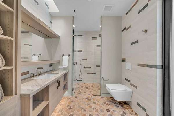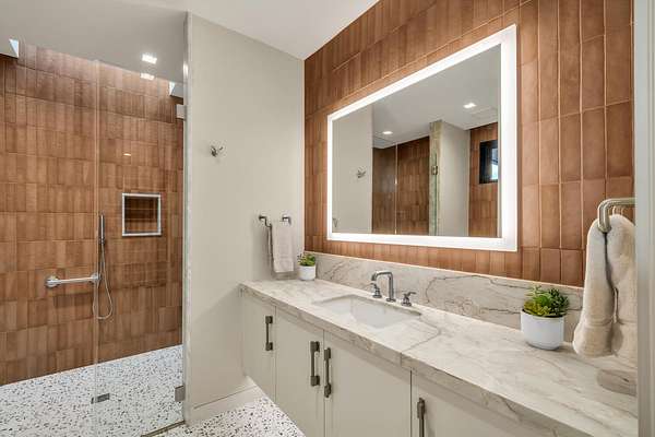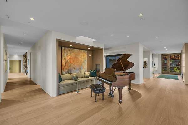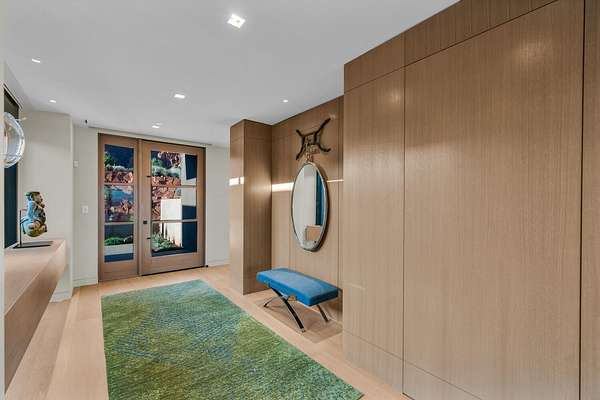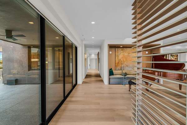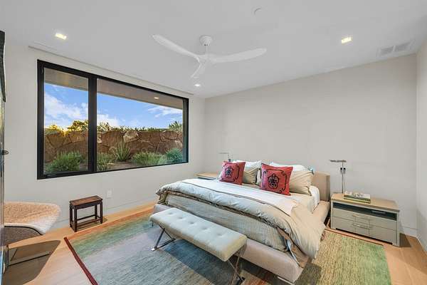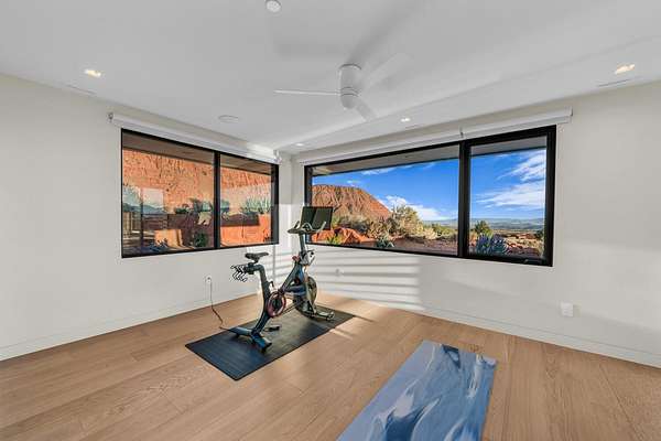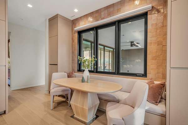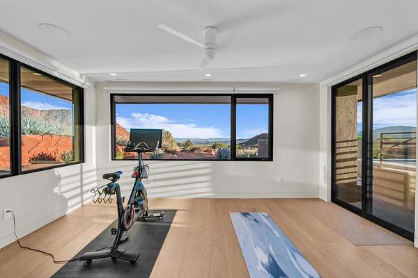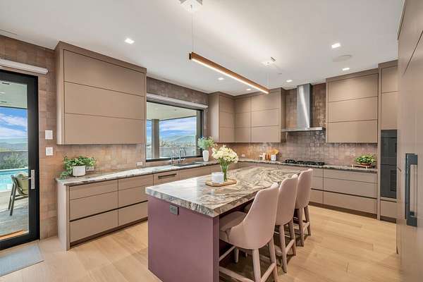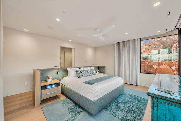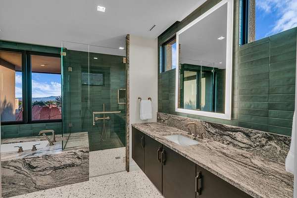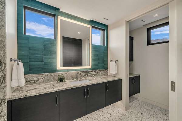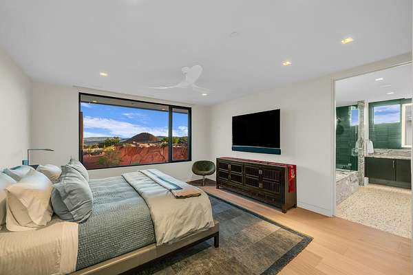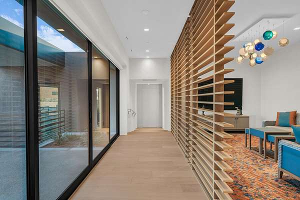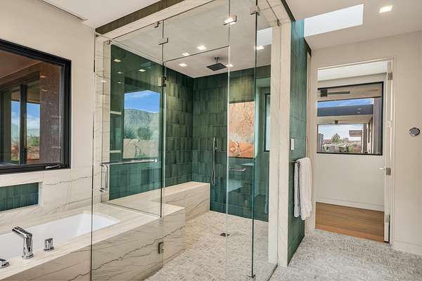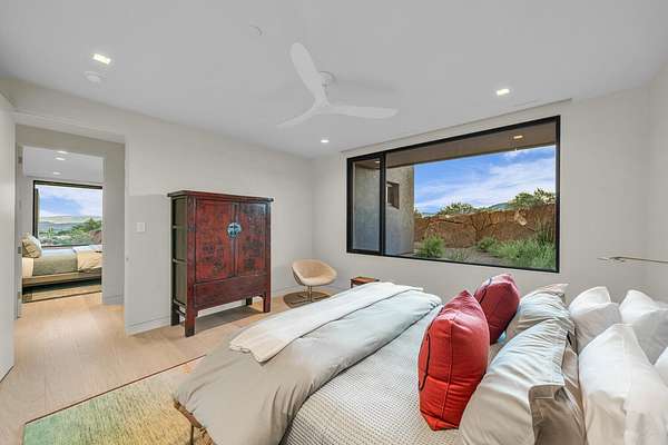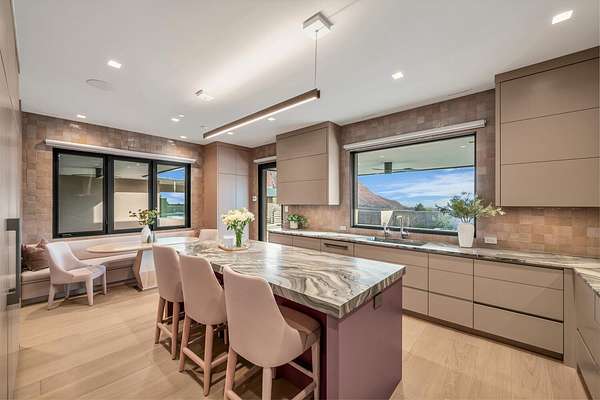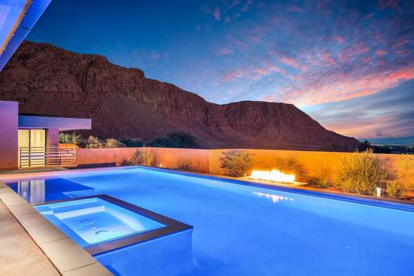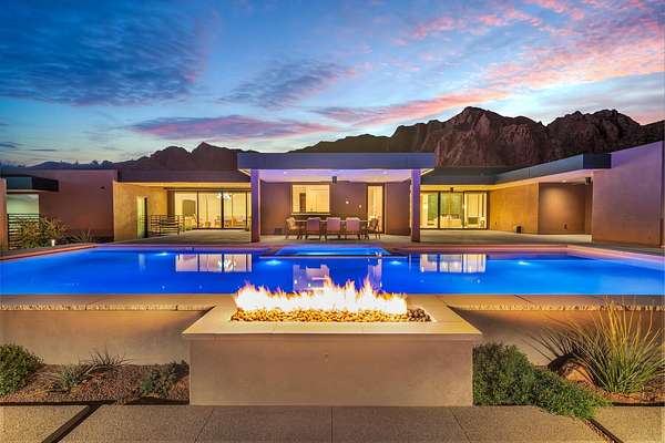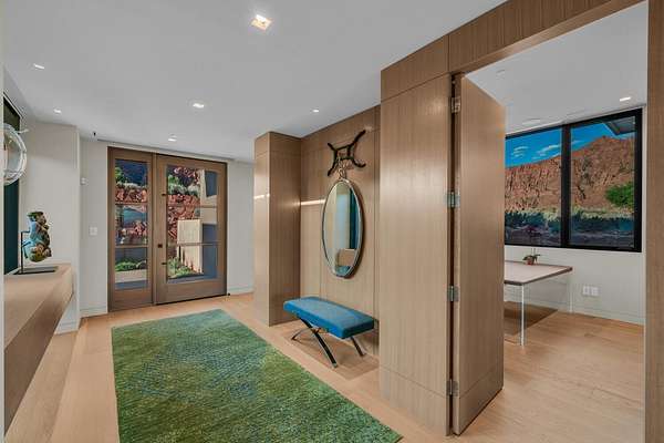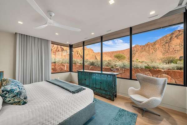 As seen in Architectural Digest, this design-forward desert residence is set against the breathtaking red cliffs of Kayenta, where contemporary architecture and the surrounding landscape exist in quiet harmony. Interior design by KSA Design Group in Chicago brings a refined sensibility to every space, creating a residence that feels both sophisticated and deeply connected to the natural beauty that surrounds it. Expansive walls of glass frame the ever-changing colors of the desert sky and sandstone cliffs, blurring the boundary between indoors and out. Clean architectural lines, organic materials, and a restrained natural palette create interiors that feel calm, grounded, and quietly elegant. At the heart of the residence, the thoughtfully designed living room - showcased in Architectural Digest - features a striking tiled fireplace wall inspired by the surrounding desert landscape. Rich textures and a nuanced green glaze echo the tones of the cliffs and vegetation beyond the expansive window wall, creating a dramatic focal point that brings the beauty of the desert directly into the interior. Designed for both connection and retreat, the open layout flows naturally between gathering spaces and private areas. Mornings begin with coffee as the rising sun washes the red cliffs in warm light, while evenings invite conversation beside the fire as the desert sky deepens overhead. The spa-inspired primary suite includes a dedicated yoga and exercise studio, creating a serene setting for wellness and restoration, while two ensuite guest rooms and a separate lounge provide comfortable accommodations for friends and family. Technology is seamlessly integrated throughout the residence. Savant home automation and Lutron lighting and shading systems allow lighting, climate, audio, security, and privacy to adjust effortlessly to your preferences, while automated shades and adaptive lighting work in harmony with natural daylight throughout the day. A Tier 1 solar system further supports efficient and sustainable living. Outdoor living is equally compelling. Expansive patios, a sparkling pool with integrated hot tub, and a dramatic fire feature create inviting spaces to gather, entertain, or simply unwind beneath the vast desert sky. Whether enjoying a quiet morning swim or hosting friends as the desert landscape shifts through sunset colors, the setting offers a rare sense of tranquility and connection to nature. A modern desert sanctuary, this residence brings together thoughtful architecture, refined design, and the timeless beauty of Kayenta to create a home that feels both elevated and deeply restorative.
