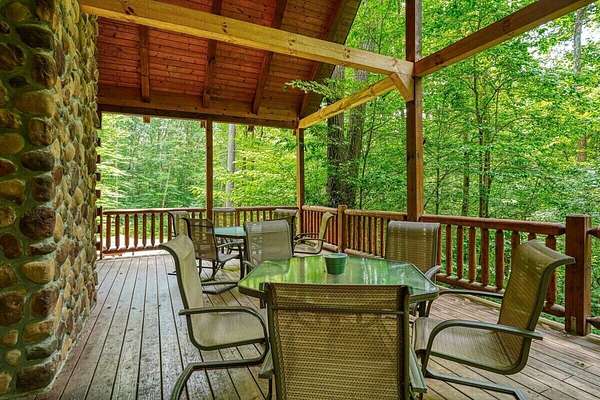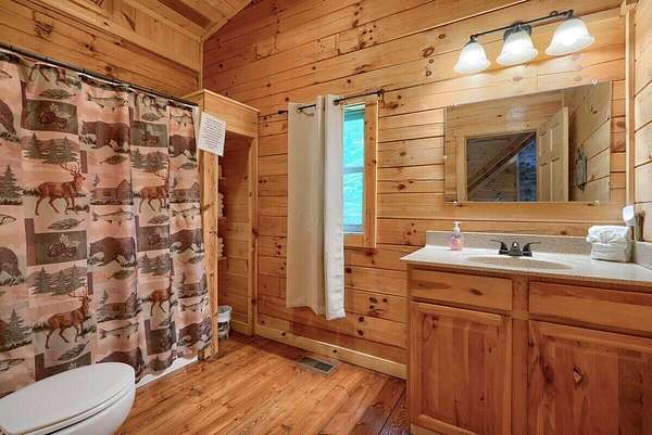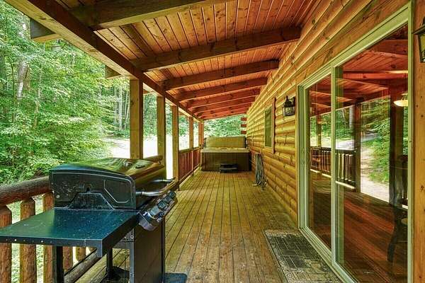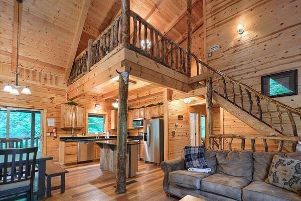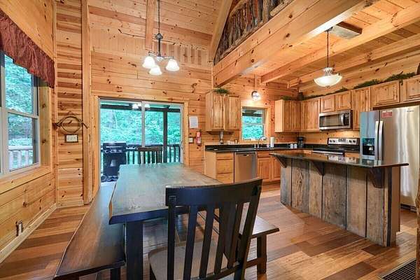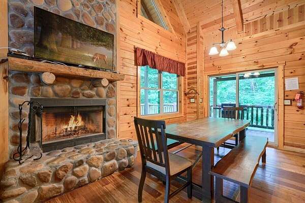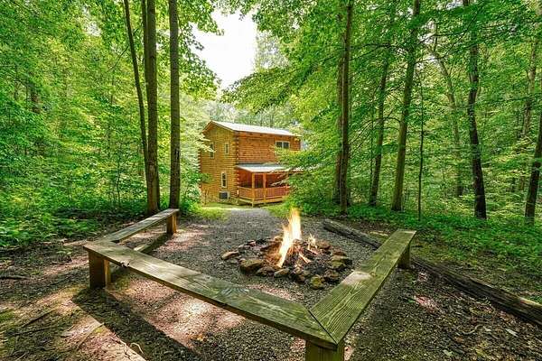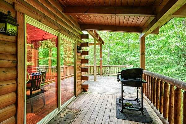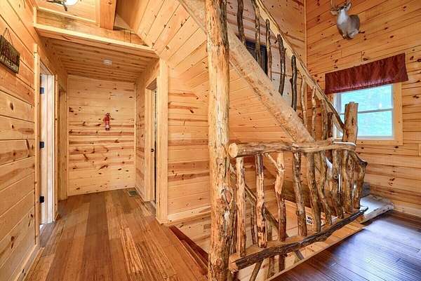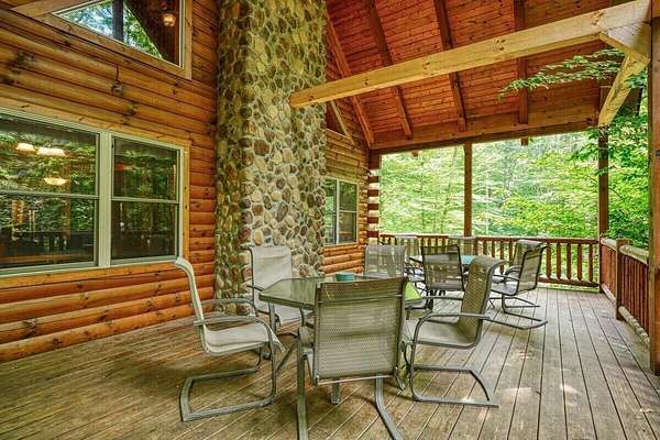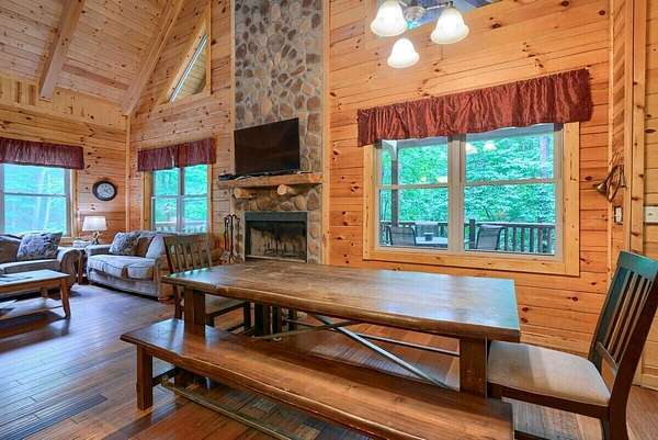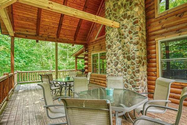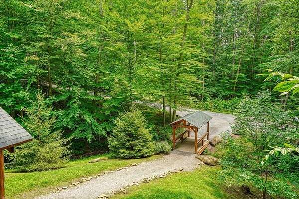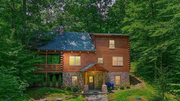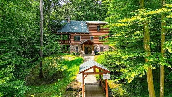 Welcome to Twin Creeks, a fully furnished five bedroom cabin set on eight private wooded acres with a scenic creekside setting and a charming covered bridge entry. This turnkey property offers three levels of finished living space, multiple king suites, an open main living area with a stone fireplace, and a lower level recreation room ideal for group stays. The home comfortably sleeps up to sixteen guests and provides a well planned layout for gatherings, retreats, or multi family use. Outdoor living spaces include covered porches, wooded views in every direction, and direct access to the property's two natural creeks. The setting is quiet and secluded with no close neighbors, offering true privacy. Twin Creeks operates as a high performing short term rental with a strong rental history and excellent year round demand. The sale includes all furnishings, providing a seamless transition for personal use or continued rental operation.