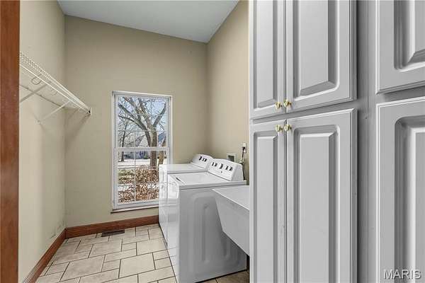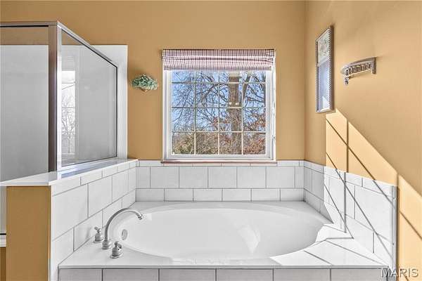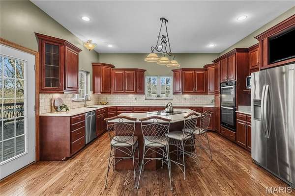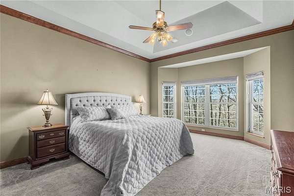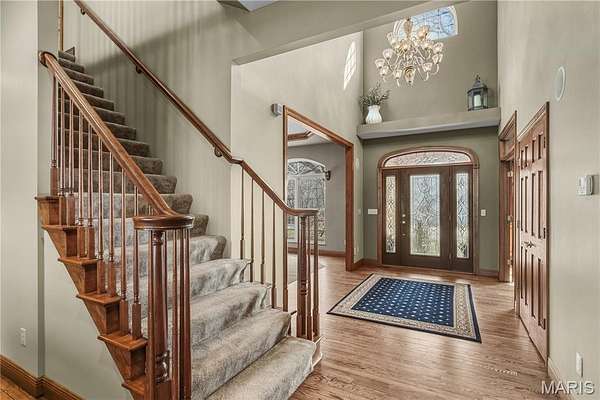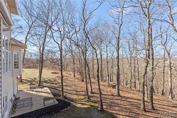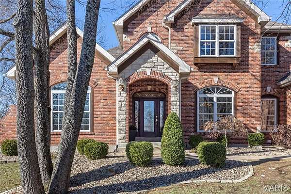 Elegant 1.5-story home situated on an exceptional 3-ACRE LOT with natural woods overlooking Dardenne Creek, featuring 6 bedrooms, 5 baths and a finished walkout lower level. Stately curb appeal with a BRICK AND STONE exterior, portico-covered entry, manicured landscaping, and an oversized, side-entry, 3-CAR GARAGE, which includes an EV charging outlet. This well-appointed home features luxury details: recently refinished HARDWOOD floors, grid windows and transoms, vaulted and tray ceilings, rich CUSTOM WOODWORK, crown molding, and solid wood doors for soundproofing. A soaring 2-story foyer opens to a grand dining room, across from French doors to an impressive office with built-ins. The great room provides stunning PANORAMIC SUNSET VIEWS from a dramatic wall of windows. Along with abundant natural light, a 2-sided gas fireplace and built-ins bring additional warmth to the space. Beyond the great room, there is a large, open kitchen designed for gatherings with a brick/stone fireplace, bay window, upgraded 42" wood cabinets, a BUTTERFLY ISLAND bar with cooktop, gorgeous QUARTZ counters, STAINLESS steel appliances, double ovens, and access to a large, SCENIC DECK. The main-floor primary suite features a tray/crown ceiling, bay window, walk-in closet, soaking tub and step-in shower. Upstairs, a SPACIOUS LOFT allows for flexible use. A Jack and Jill bathroom connects two of the well-proportioned bedrooms. A third bedroom and an additional bathroom finish the upper floor. The lower level showcases an ENTERTAINMENT BAR and recreation room with French doors leading to an OVERSIZED PATIO and views of an everchanging display of nature. Two more generously sized bedrooms and a full guest bathroom complete the lower level. Convenient double-door access to a basement storage area makes storing lawn equipment or patio furniture a breeze. An expansive side yard of open lawn provides ample opportunity for play and gardening. Peace of mind with a NEW ROOF. This highly-sought subdivision feels secluded, while errands are within an easy 3 miles. Just off Hwy DD and minutes from wine country, Broemmelsiek Park, O'Day Park, and the Katy Trail. In the award-winning Francis Howell School District.