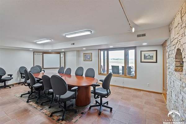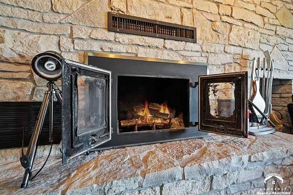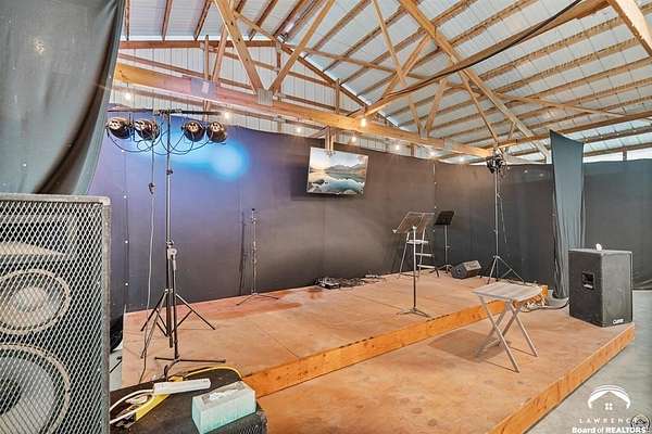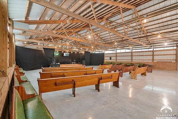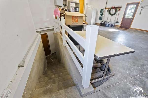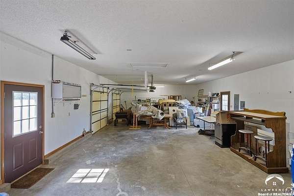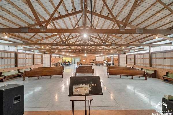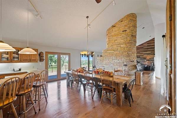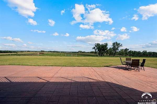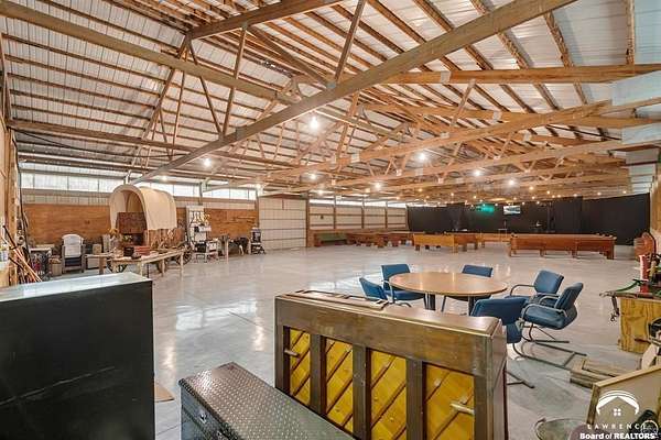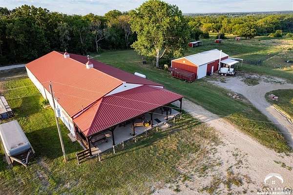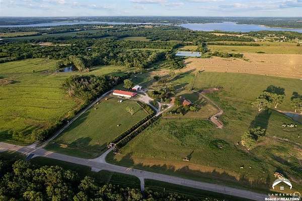 Stunning 18-acre country retreat overlooking Perry Lake with endless potential for an agricultural oasis, Airbnb, or event venue. This 5,000+ sq ft ranch-style home offers 4BR, 3.5BA, vaulted ceilings, 2 stone fireplaces, and a chef's kitchen with walk-in pantry and island. The luxurious primary suite has a spa-like bath and dual closets. Also, the Walk-out basement features a 2nd kitchen, family room, office/conference space, and ample storage. Outdoor living includes a massive deck, covered patio, and spacious fire pit area perfect for entertaining. Nearly 9,000 sq ft of garage/workshop space includes a 30x60 shop and a 51x120 outbuilding with heated/cooled office and full bath. The property is Zoned Farm & Ag with 5 animal shelters, 4-5 fenced pastures, 6 hydrants, horse arena, and 2 RV hook-ups. Ideal for weddings, retreats, or hobby farming. This is the perfect home to live, work, and host with ease.