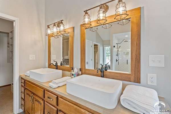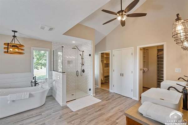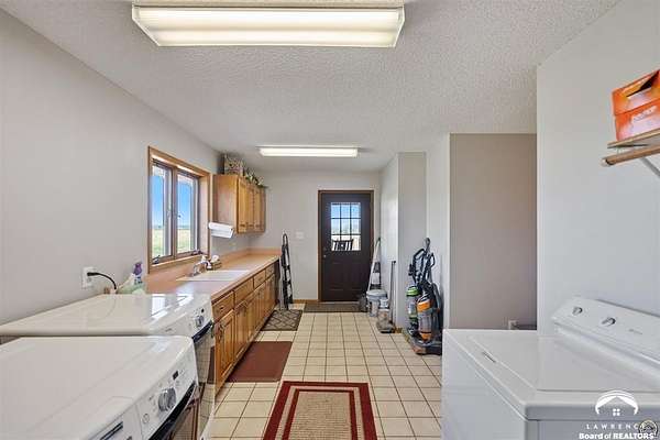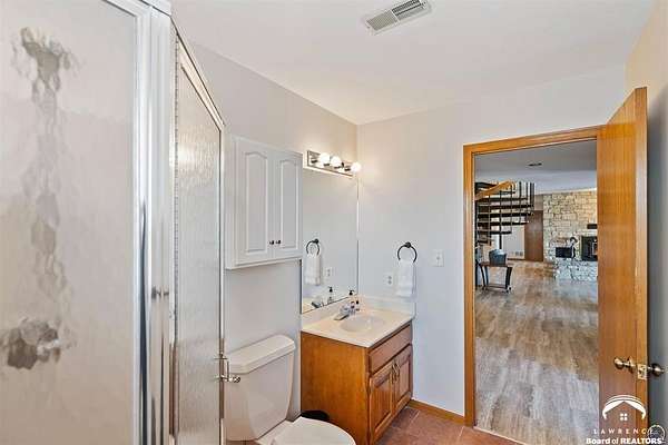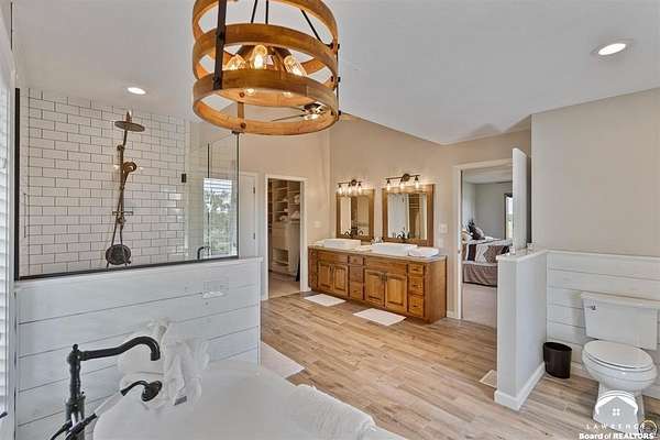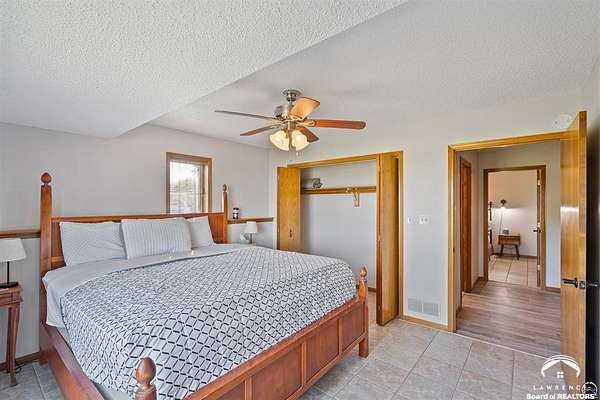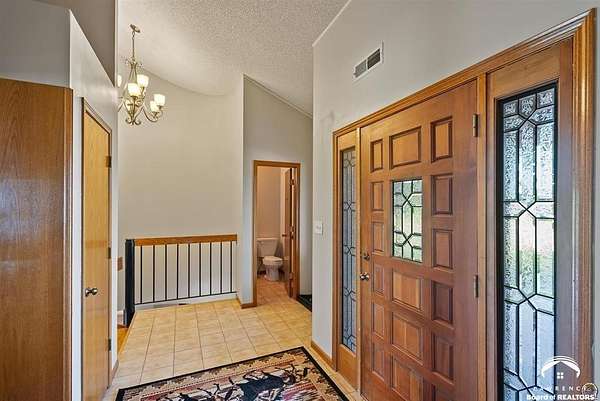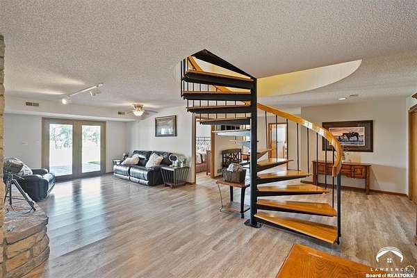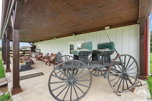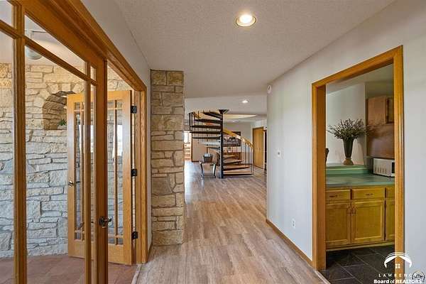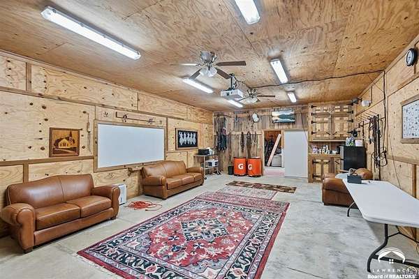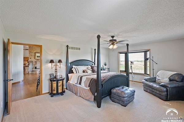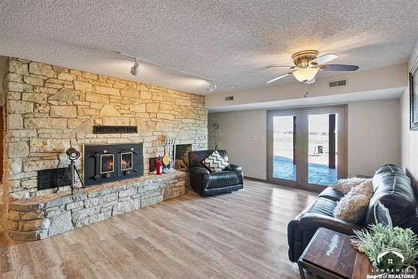 Stunning 18-acre country retreat overlooking Perry Lake with endless potential for an agricultural oasis, Airbnb, or event venue. This 5,000+ sq ft ranch-style home offers 4BR, 3.5BA, vaulted ceilings, 2 stone fireplaces, and a chef's kitchen with walk-in pantry and island. The luxurious primary suite has a spa-like bath and dual closets. Also, the Walk-out basement features a 2nd kitchen, family room, office/conference space, and ample storage. Outdoor living includes a massive deck, covered patio, and spacious fire pit area perfect for entertaining. Nearly 9,000 sq ft of garage/workshop space includes a 30x60 shop and a 51x120 outbuilding with heated/cooled office and full bath. The property is Zoned Farm & Ag with 5 animal shelters, 4-5 fenced pastures, 6 hydrants, horse arena, and 2 RV hook-ups. Ideal for weddings, retreats, or hobby farming. This is the perfect home to live, work, and host with ease.