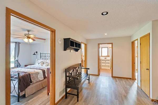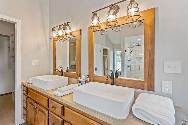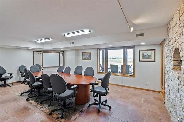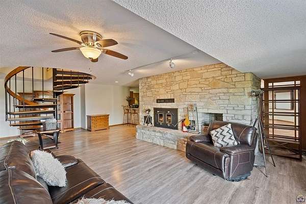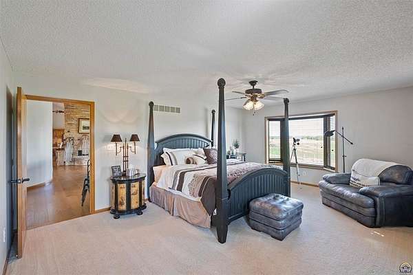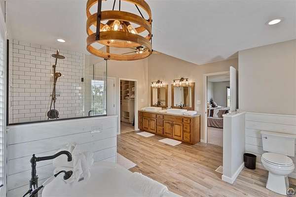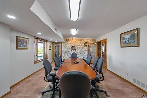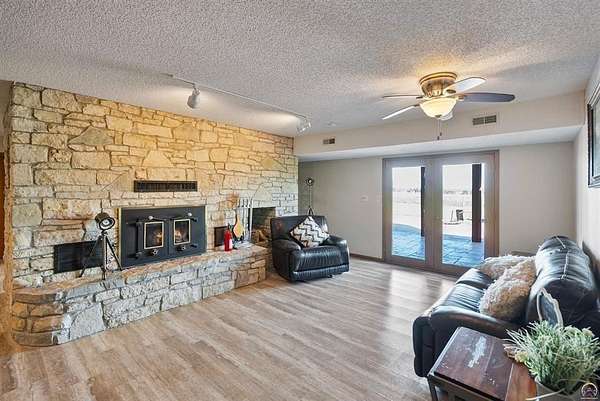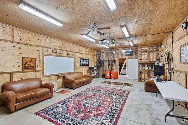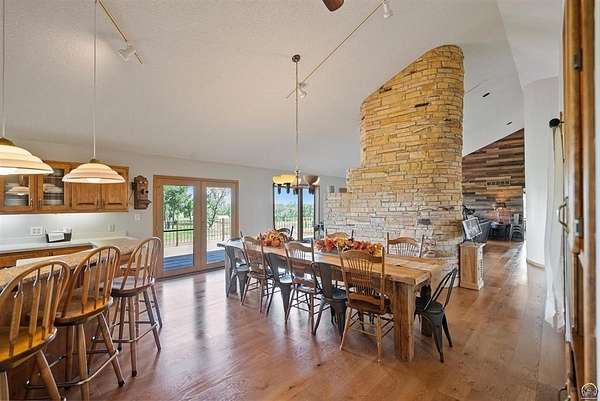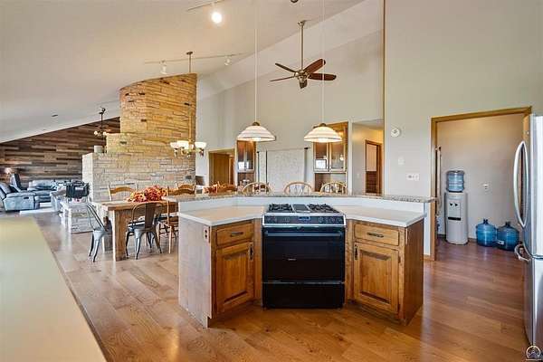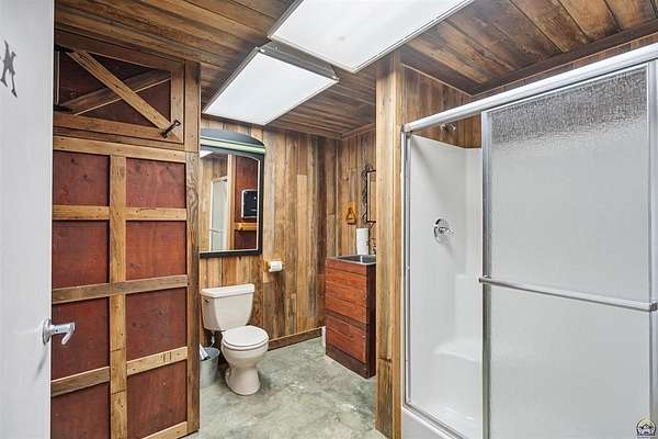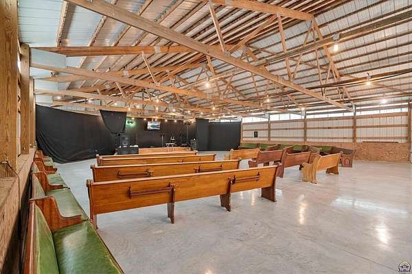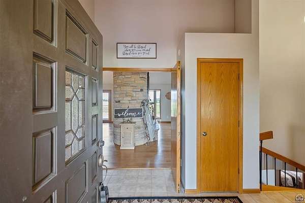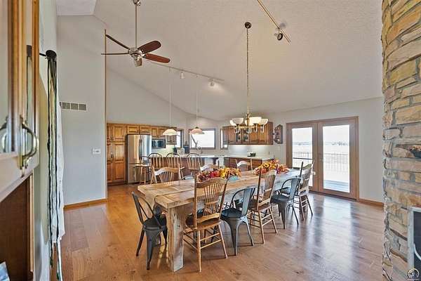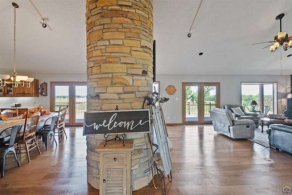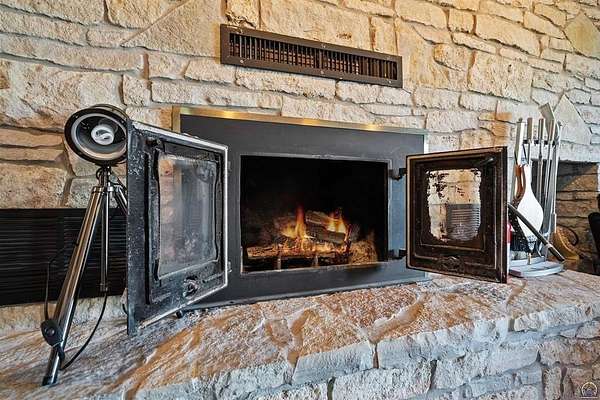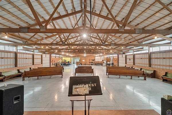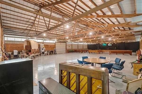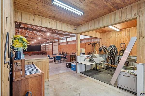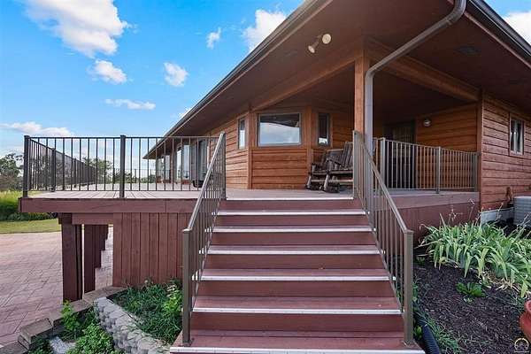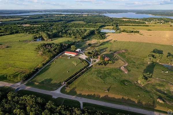 Stunning 18-acre country retreat overlooking Perry Lake with endless potential for an agricultural oasis, Airbnb, or event venue. This 5,000+ sq ft ranch-style home offers 4BR, 3.5BA, vaulted ceilings, 2 stone fireplaces, and a chef's kitchen with walk-in pantry and island. The luxurious primary suite has a spa-like bath and dual closets. Also, the Walk-out basement features a 2nd kitchen, family room, office/conference space, and ample storage. Outdoor living includes a massive deck, covered patio, and spacious fire pit area perfect for entertaining. Nearly 9,000 sq ft of garage/workshop space includes a 30x60 shop and a 51x120 outbuilding with heated/cooled office and full bath. The property is Zoned Farm & Ag with 5 animal shelters, 4-5 fenced pastures, 6 hydrants, horse arena, and 2 RV hook-ups. Ideal for weddings, retreats, or hobby farming. This is the perfect home to live, work, and host with ease.