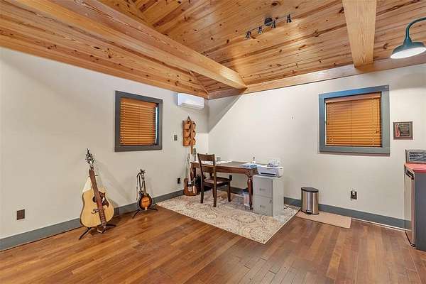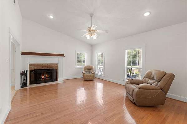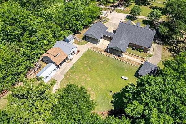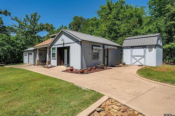 Tucked away on 3.2 wooded acres in Alba, this single-level home blends privacy, charm, and versatility. Inside, you’ll find high ceilings, wood floors, a cozy fireplace, and scenic views from every window. The kitchen offers ample cabinetry and a gas range, with a dining area perfect for entertaining. The primary suite includes an ensuite bath and spacious closet, with a second bedroom, bath, and a flexible room for office, hobby, or extra bedroom use. Enjoy the large sunroom, 24x40 covered patio overlooking Cottonwood Creek, and 50-ft front porch. Property features include covered RV boat parking, two climate controlled outbuildings (office and gym), additional storage buildings, wrought iron fencing, a 140 ft concrete driveway with automatic gate, and beautiful iron ore stonework. Wildlife and sunsets complete the peaceful setting, just 90 minutes from Dallas and 10 minutes to Lake Fork. Includes new survey and fiber optic internet.
