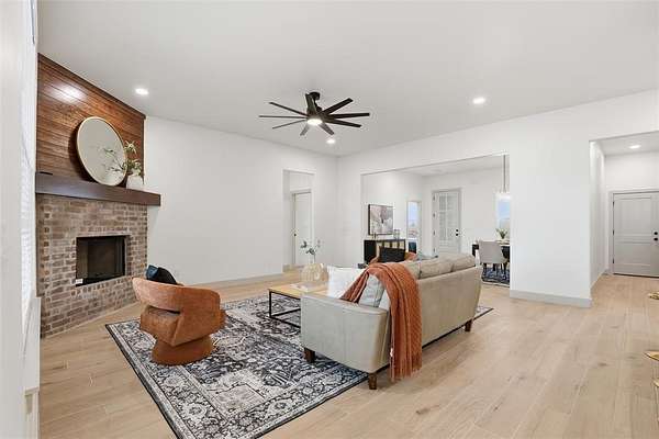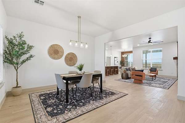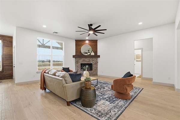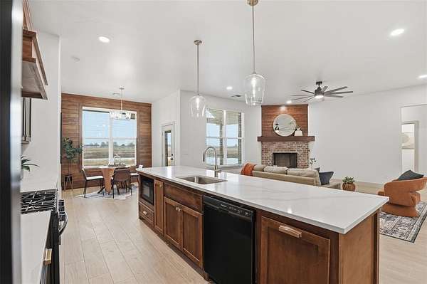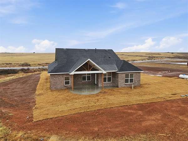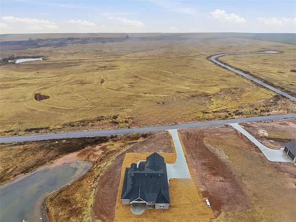 This stunning 4 bedroom, 2.5 bathroom home sits on 3.15 acres with breathtaking water views and ownership of a portion of the private pond directly behind the property. The neighborhood also features a second community pond, giving you even more space to enjoy peaceful sunsets, fishing, and the quiet setting Prairie Farms is known for. Inside, the details stand out immediately. Wood-look tile flows throughout the main areas, blinds are already installed, and the home is filled with warm wood accents and designer lighting. The kitchen features custom-built cabinetry with beautiful wood detailing, soft-close drawers and doors, quartz countertops, brass accents, and an extra-long island perfect for gathering. A gas stove, wood-accent vent hood, and a bright breakfast nook overlooking the acreage make this space both functional and elevated. A flexible formal dining room offers options for hosting, an office, or even a second living area. The living room includes a gas fireplace and large windows that frame serene pond and acreage views from every angle. The private primary suite offers a standalone soaking tub, walk-in shower, and curated tile and fixture selections that create a true spa feel. The primary closet is truly a dream, extra spacious with built-in dresser-style storage, custom racks that reach all the way to the ceiling, and a standing mirror that makes the space feel luxurious and beautifully design. Additional upgrades include a propane system, tankless water heater, water softener, and full gutters, along with a spacious three-car garage. Located in Tuttle Schools with paved roads and livestock welcome, this home delivers the perfect blend of privacy, land, comfort, and custom craftsmanship. If you're looking for a home that offers quality, peaceful views, and a true custom feel from top to bottom, this one checks every box. ASK ABOUT 1% LENDER CREDIT FROM PREFFERED LENDER!