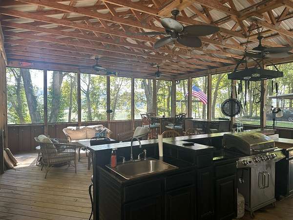 Wake up to breathtaking riverfront views in this beautifully designed open-concept retreat that blends comfort, flexibility, and natural beauty. Expansive screened in porch area gives you the water scenery, filling the space with natural light and creating a seamless connection to the outdoors. The thoughtfully planned interior features a sleek open layout with a Murphy bed, allowing the space to effortlessly transform from a stylish living area into a cozy sleeping retreat. Whether you're entertaining guests or enjoying a quiet evening by the river, the design adapts to your lifestyle with ease. Step outside and take in the stunning surroundings - perfect for morning coffee, sunset gatherings, or simply soaking in the peaceful flow of the river. Adding exceptional value and versatility, the detached pole barn offers endless possibilities for storage, hobbies or workshop space. This unique riverfront property is a rare opportunity to enjoy.