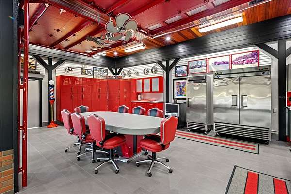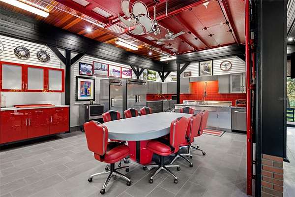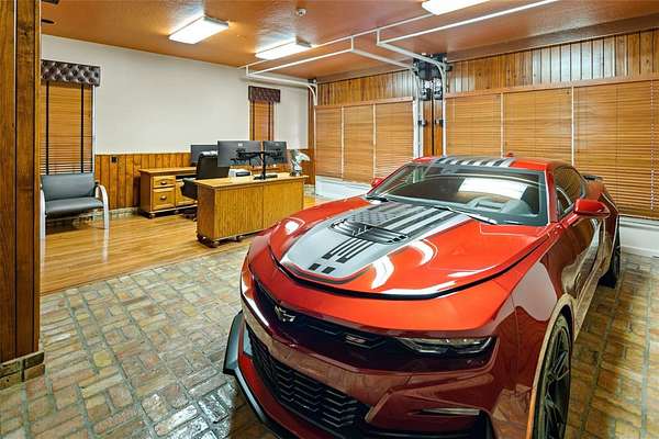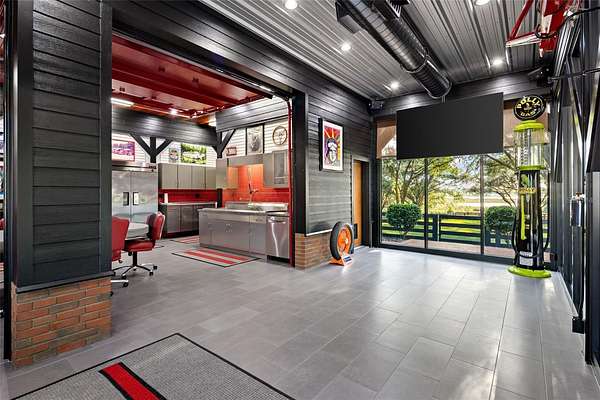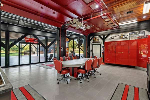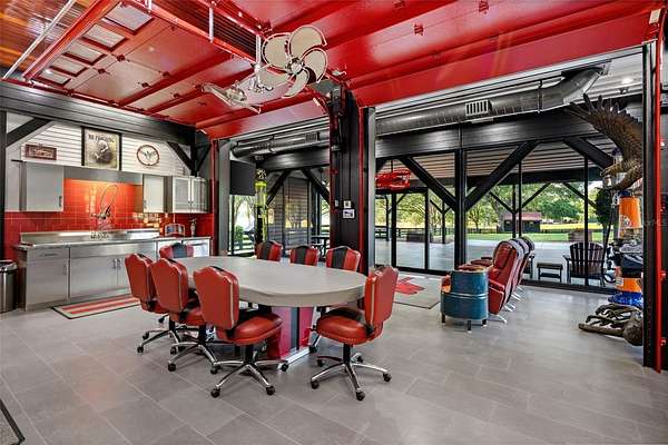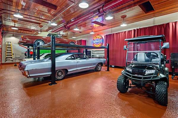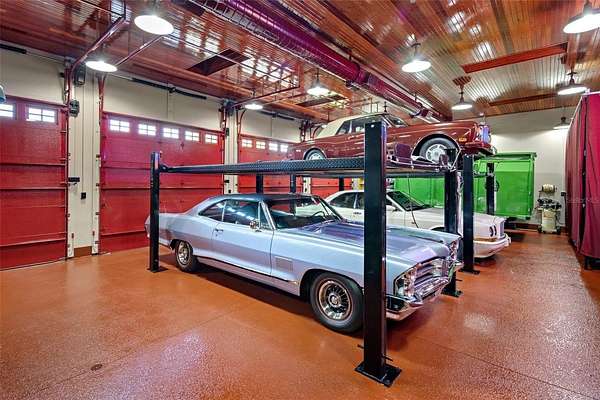 At the heart is a 3,041-square-foot farmhouse rich in warmth and architectural character, offering 3 bedrooms, 2.5 bathrooms, a flex room, and a second-floor bonus space. Thoughtfully designed for function and lifestyle, the estate is further enhanced by a detached lake side retreat—featuring a 4-car garage with 13-foot doors, multiple vehicle lifts, epoxy floors, and an integrated compressor system. An air conditioned 2nd story storage area is accessed by elevator. The commercial kitchen, comfortable gathering area, and private lounge create a truly unique environment for entertaining and displaying prized possessions.