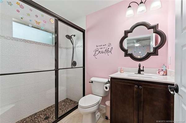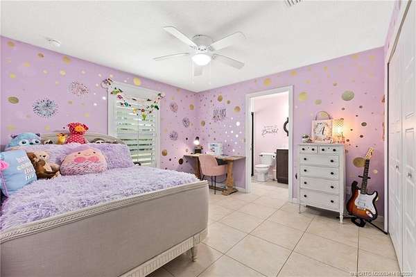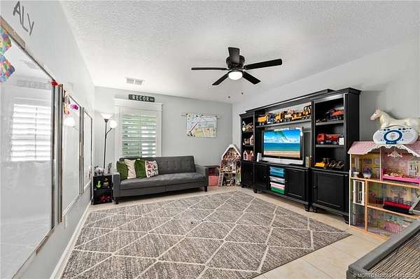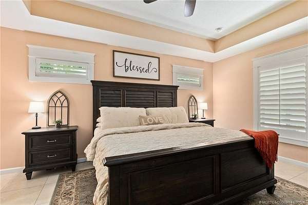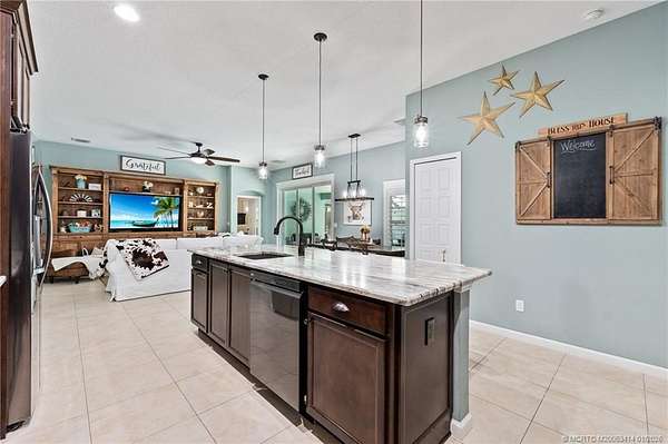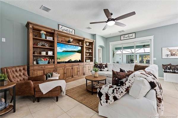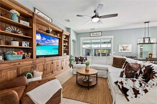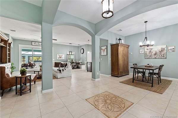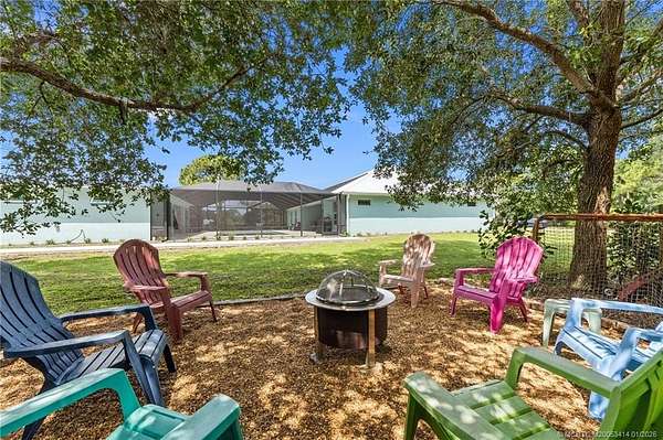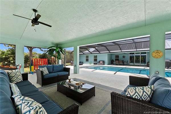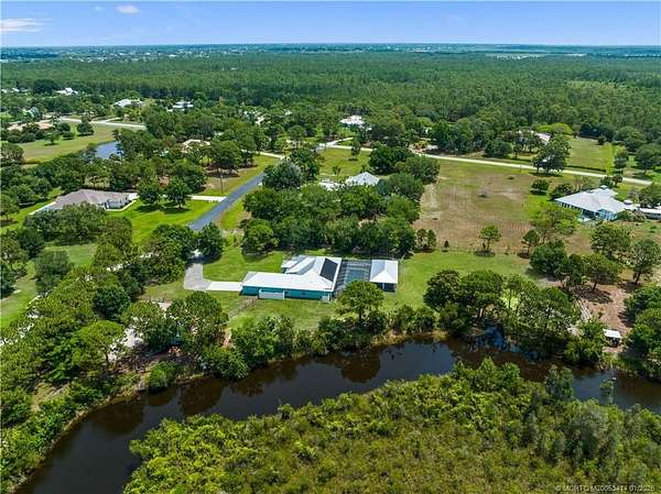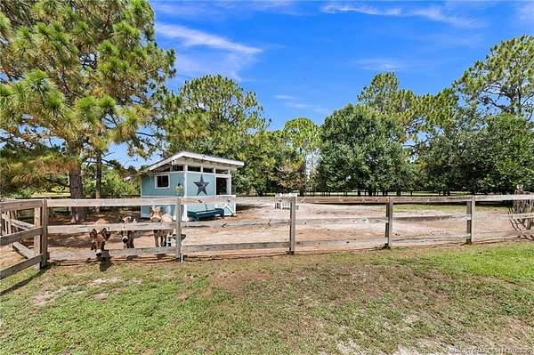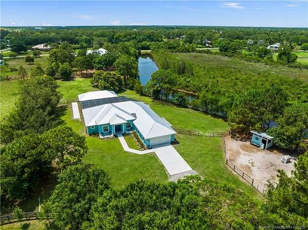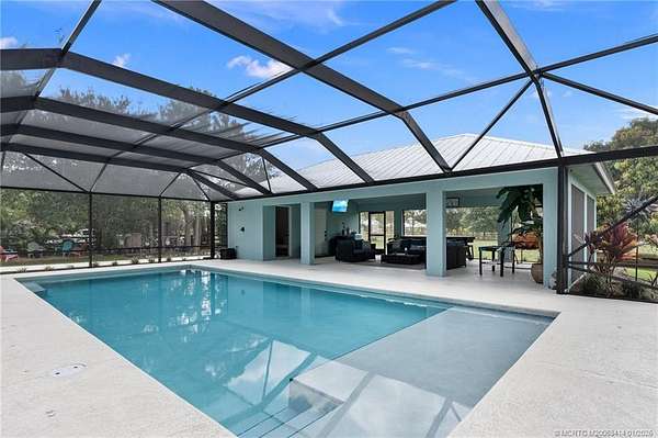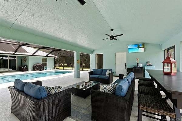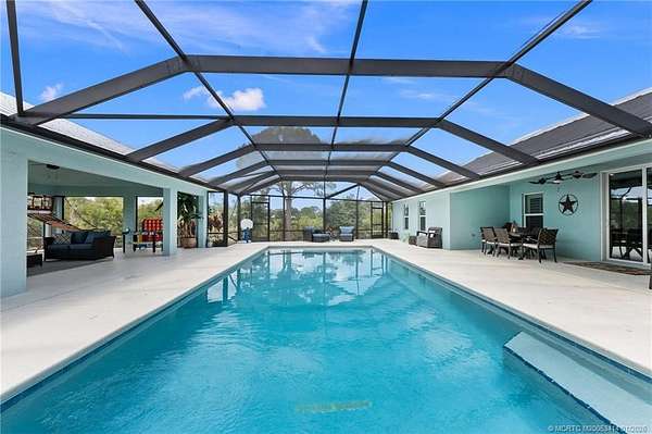 Every day is a vacation in this custom CBS 4 bedroom, 4.5 bath open concept home that has it all! Split bedroom plan, a center island kitchen with wood cabinets & marble which opens to the dining and living areas, and a large bonus room perfect for a playroom, home office/school, gym, or can easily be converted to a 5th bedroom. The primary suite features two walk-in closets, a bath with a large walk-in shower, and a double vanity. The pocket slider opens to where vacation begins on the covered lanai perfect for outdoor dining with a saltwater pool, 20 x 40 outdoor "living room" with a half bath & golf cart garage all screened for year-round enjoyment. Other features include tile throughout the home, impact windows & doors, and an oversized two-car garage. The yard is fenced and gated with 1 paddock and 12x12 barn, irrigation system, boat launch (electric or man-powered), fruit trees & sweeping open water views. Located in a gated community close to shopping, schools, & highways.