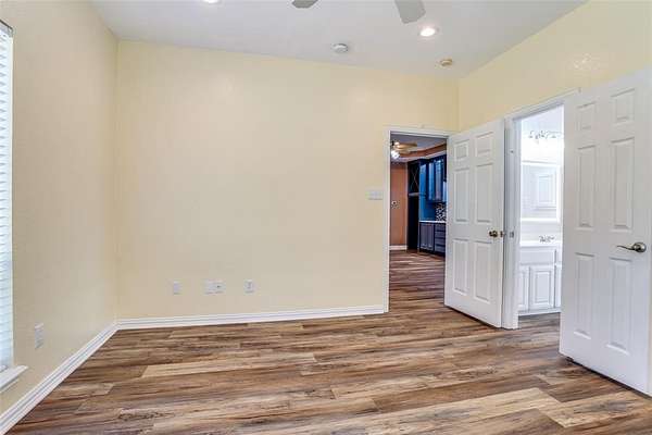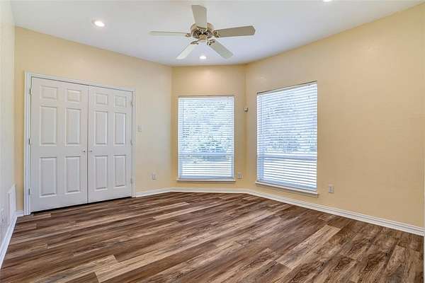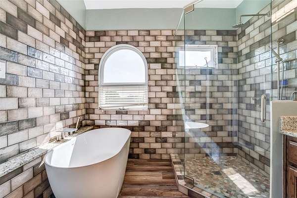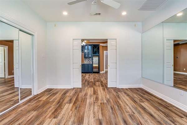 The inviting den features a built-in bar, wine storage, wine fridge, and space for an additional refrigerator--ideal for entertaining. An exercise room can serve as a fifth bedroom and shares a full bath with the den and pool area. Two additional first-floor bedrooms are connected by a Jack-and-Jill bath. Upstairs, the primary suite boasts an updated bath with a solid-surface soaking tub, while an additional bedroom or office provides flexible space.