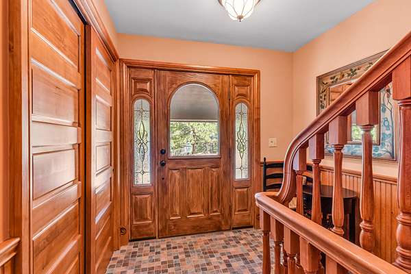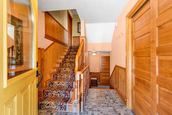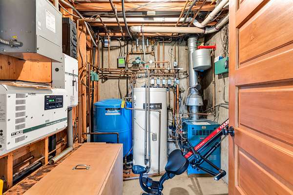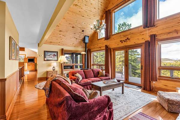 Great Room: Showcases 16′ ceilings, extensive woodwork, hardwood floors, a working fireplace with a thermal energy storage system, and a Vermont Castings wood stove.