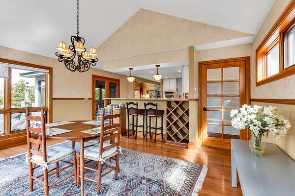 Dining Room: Boasts hardwood floors, 16′ ceilings, lit china cabinet, woodwork, wine storage, and a 20′ FM antenna input for radio.
