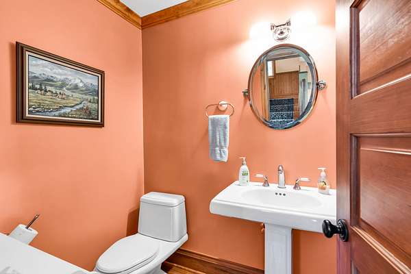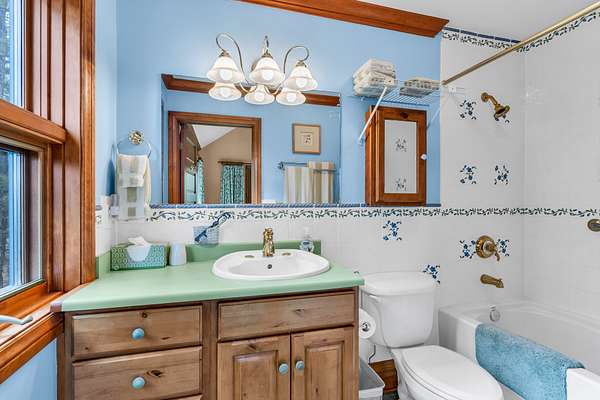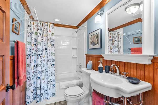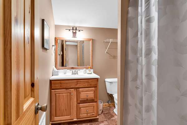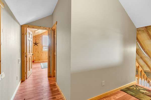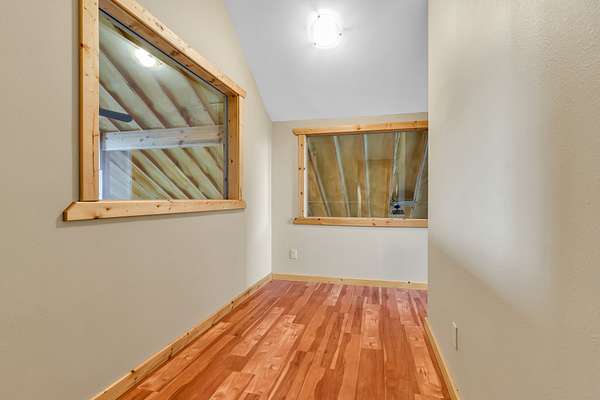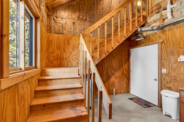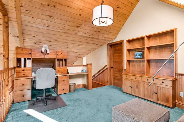 Upstairs includes a queen-size bunk (no mattress) and a full bath.