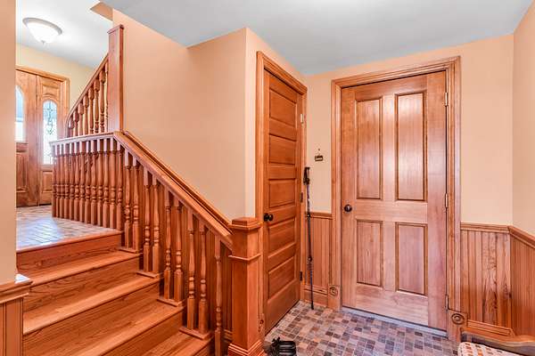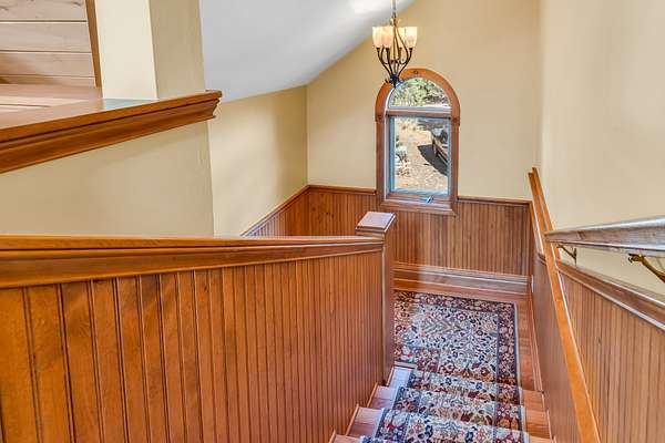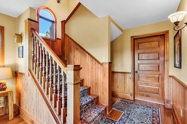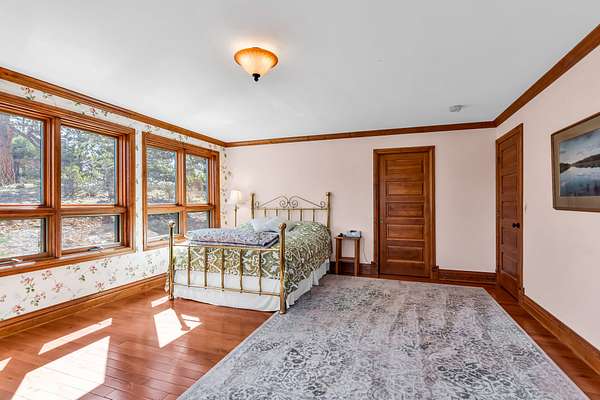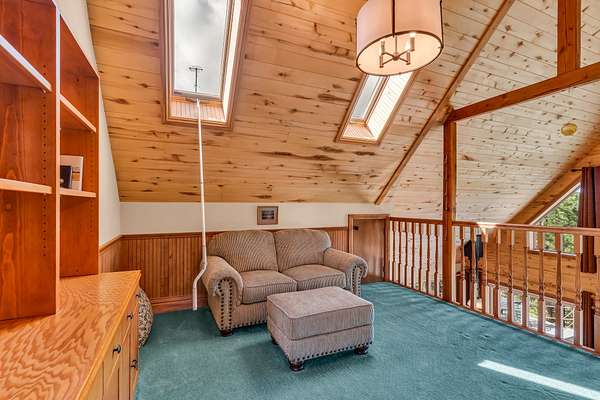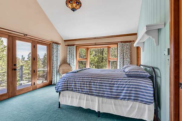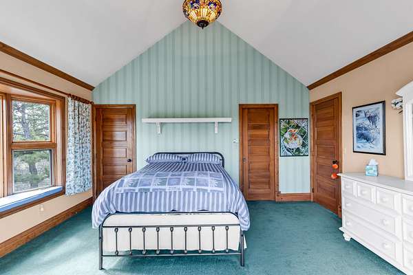 Upper Bedroom: Includes a private deck, full bath, bay window seat, walk-in closet, secret playroom, and ladder access to a carpeted attic.