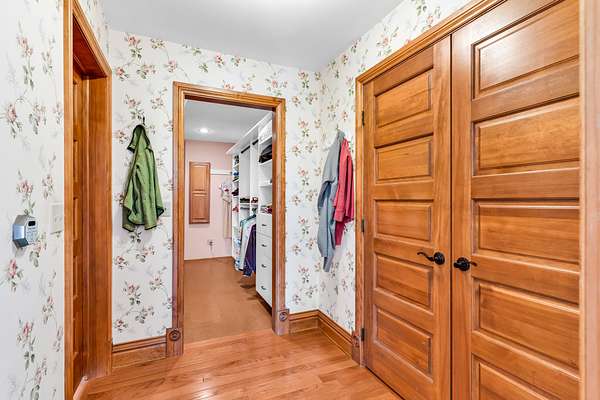 Master Closet: Custom built-in system with jewelry drawer, mirror and light, shoe shelves, and cork flooring.