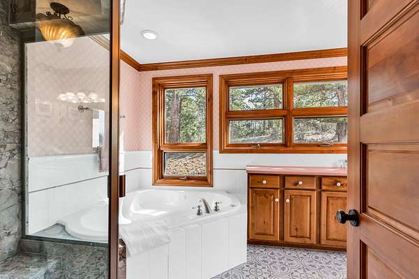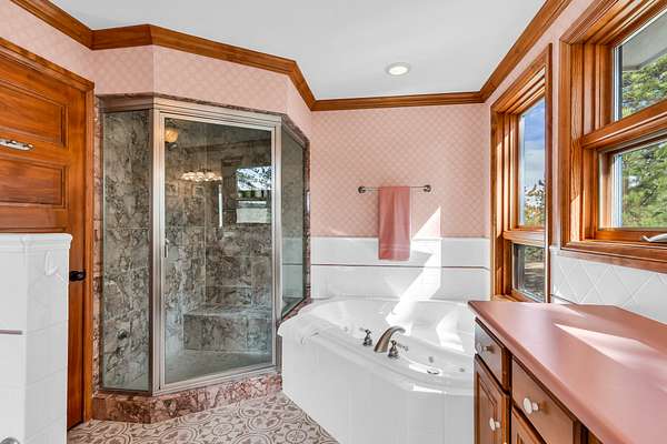 Master Bath: Includes a jetted tub, steam unit, large tile shower, tile floor, single sink with room for two, linen closet, and private (Trex) deck access.