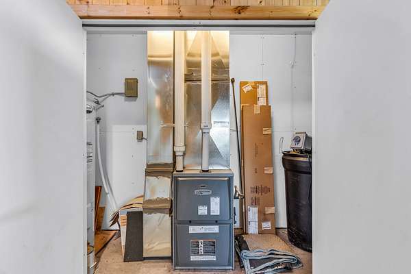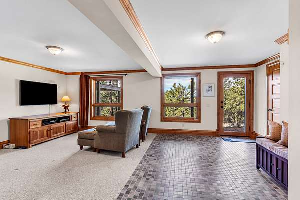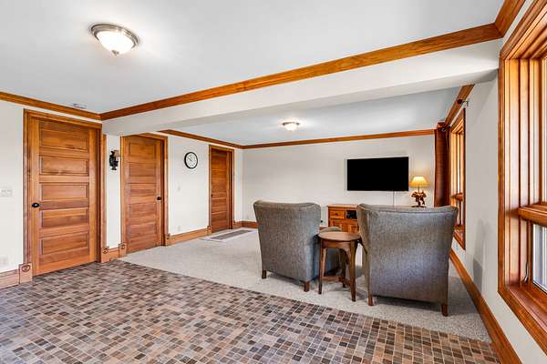Lower Bedroom/TV Room: Contains TV receiver, modem, router, DVD player, full bath, clothes closet, large storage closet, separate entrance, mechanical room, and flooring in Berber carpet and tile.
