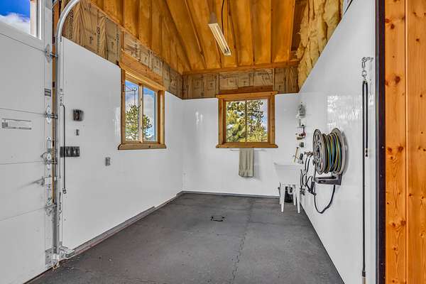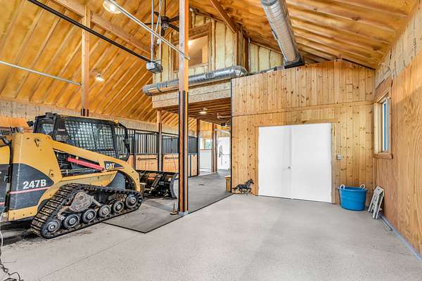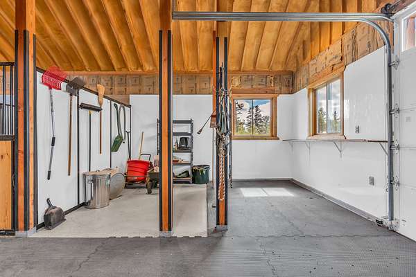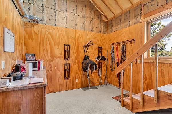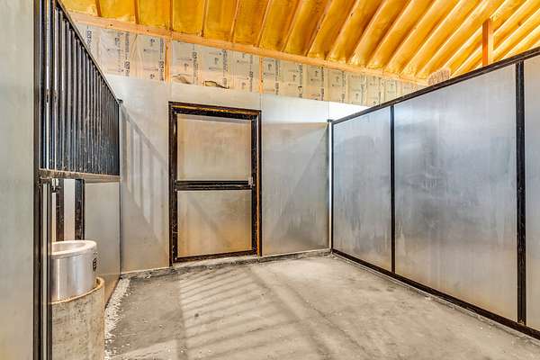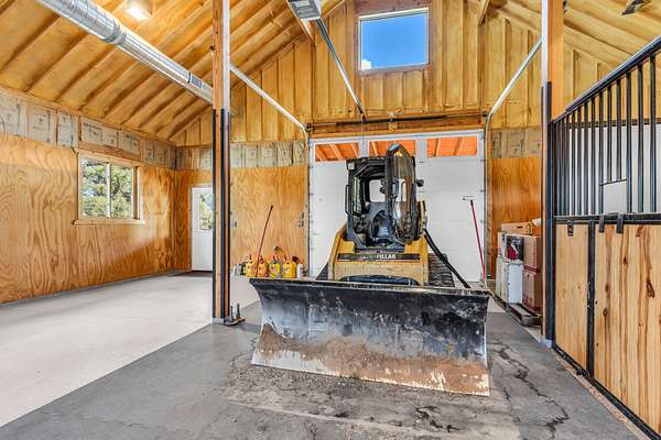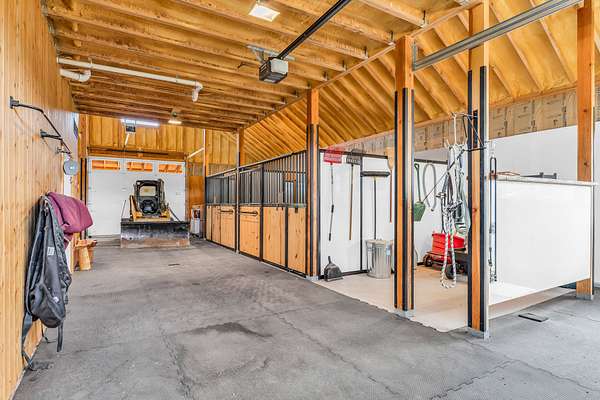 Tool bay, wash bay, tie bay, shavings bay, hay bay, and automatic overhead doors on both north and south ends.