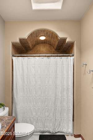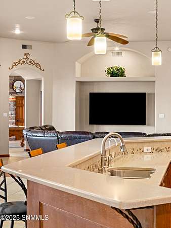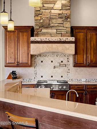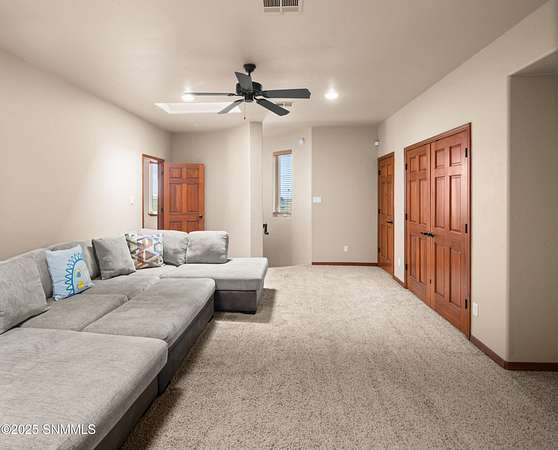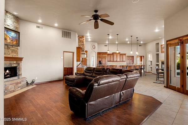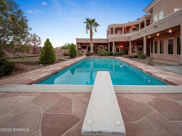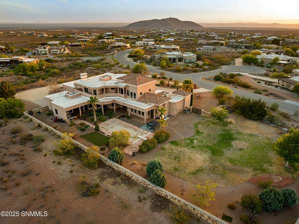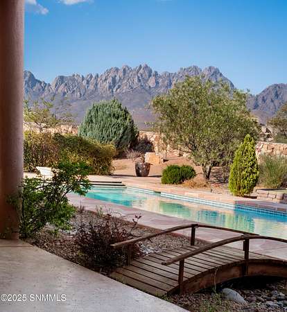 Luxury at its finest in the prestigious Desert Mirage Subdivision! At first step you are greeted with the soaring ceilings of the welcoming Foyer, Striking Staircase with Catwalk, Formal Living Room and Dining Room. The ceiling draws your eye up to the celestial wall of windows that frames the beautiful backyard and Organ Mountain Views. This beautiful home boosts 5,704 sq ft, 5 generous bedrooms, 4.5 bathrooms, Office, Movie Theater, & Game Room all on 2 acres of land. The primary suite is conveniently located on the primary floor & offers high ceilings and a luxurious spa type ensuite bathroom with steam shower and 6 person dry sauna. Main living area offers an open floor plan. The backyard is your own oasis that offers beautiful views of the Organ Mountains an outdoor kitchen, multiple lounging areas, putting green, large grass area, hot tub & a 35,000 gallon pool that includes a automatic pool cover and diving board into a 9ft deep area. Don't miss your opportunity to own your very own paradise!